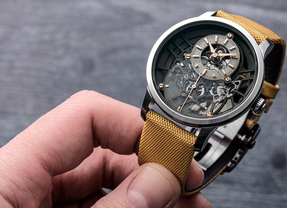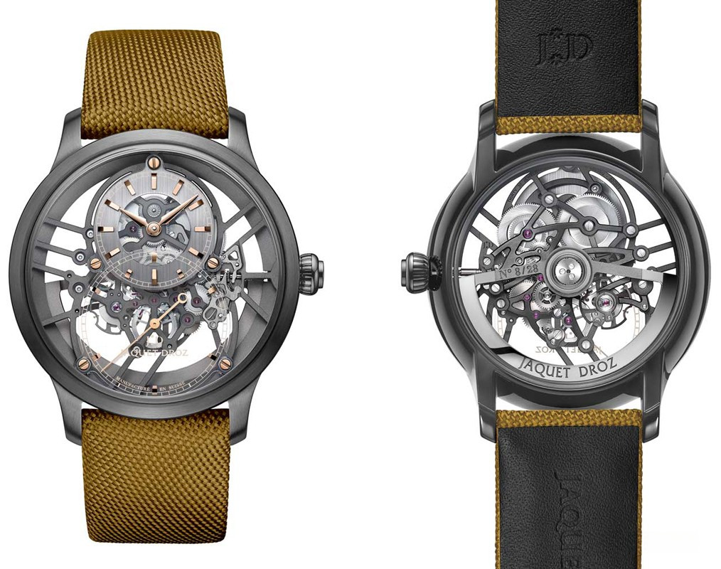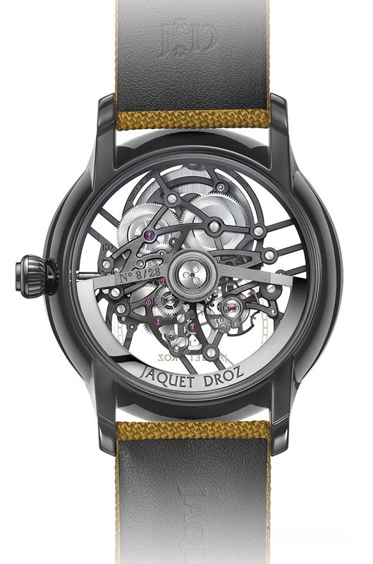 Часы Jaquet Droz Grande Seconde Skelet-One представлены в корпусе из керамики размером 41.5 х 12.48 мм и водонепроницаемостью до 30 метров. Внутри корпуса установлен автоматический механизм, Калибр Jaquet Droz 2663 SQ с запасом хода 68 часов. На сером скелетированном циферблате отображаются часы, минуты, секунды. Часы комплектуются текстильным ремешком с вставкой из нержавеющей стали. Серия ограничена - 28 шт.