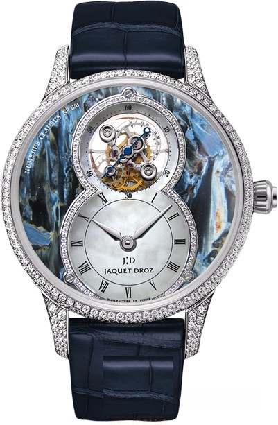 Корпус часов Jaquet Droz Legend Geneva Grande Seconde Tourbillon изготовлен из белого золота 18к. Циферблат белого жемчужный с синим петерситом и белыми бриллиантами. Оснащенный турбийоном механизм с автоматическим подзаводом, Калибр Jaquet Droz 25JD. Запас хода 7 дней. Диаметр 39 мм. Часы поставляются на ремешке из кожи аллигатора с вставкой из белого золота 18к. Корпус инкрустирован белыми бриллиантами. Часы выпущены ограниченной серией 8 шт.