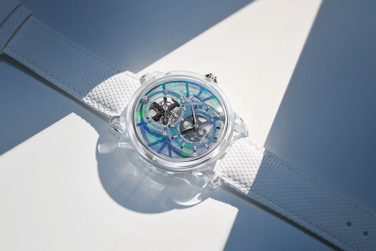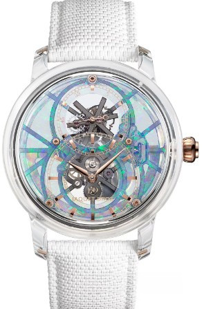 Часы Jaquet Droz Grande Seconde Tourbillon Skelet Sapphire представлены в корпусе размером 42 х 13.76 мм из сапфира водонепроницаемостью 30 метров. Внутри корпуса установлен автоматический механизм, Калибр 2625SQ, обладающий запасом хода 7 дней. На опаловом циферблате отображаются часы, минуты, секунды. Часы поставляются на каучуковом ремешке с застежкой из нержавеющей стали. Серия ограничена - 1 шт.