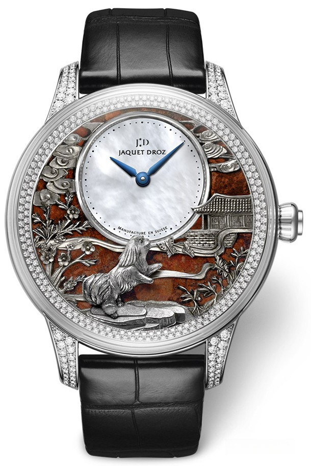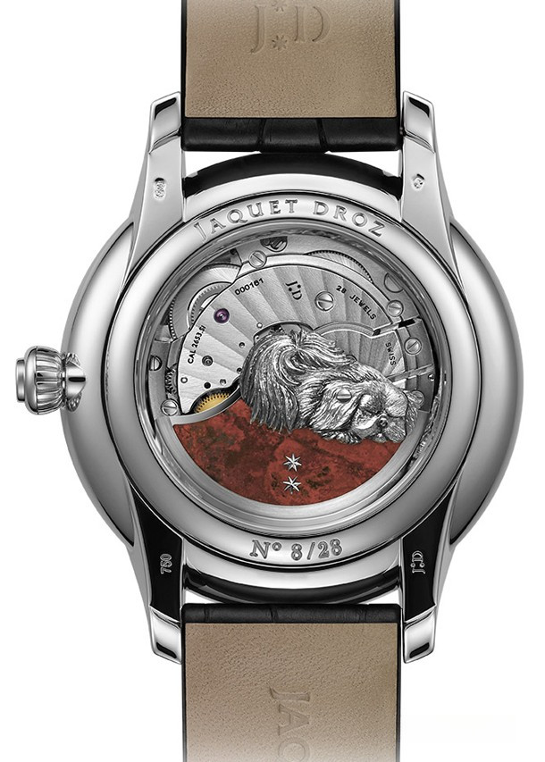 Циферблат из белого золота 750 пробы и куприта, центральная секция из белого жемчуга. Декоративные рельефные накладные отметки из белого золота 960 пробы с патиной ручной работы. Накладное рельефное изображение собаки из белого золота 750 пробы с ручной гравировкой и патиной. Корпус и накладное кольцо из белого золота 750 пробы. Механизм с автоматическим подзаводом. Запас хода 68 часов. Диаметр 41 мм. Ограниченная серия из 28 экземпляров. Калибр Jaquet Droz 2653.Si, механизм с автоматическим подзаводом, спираль и рожки анкерной вилки из кремния, двойной барабан, инерционный груз из белого золота 750 пробы и куприта, накладное рельефное изображение собаки из белого золота 960 пробы с патиной ручной работы. Корпус инкрустирован белыми бриллиантами.