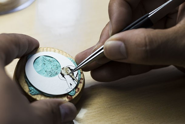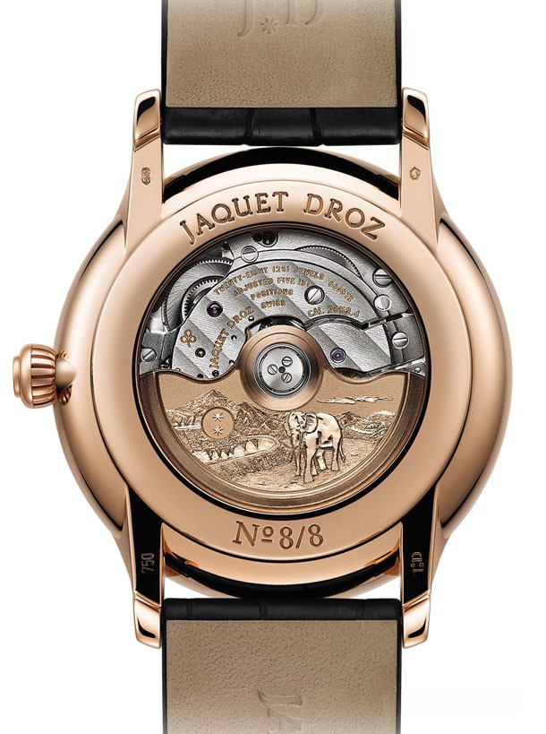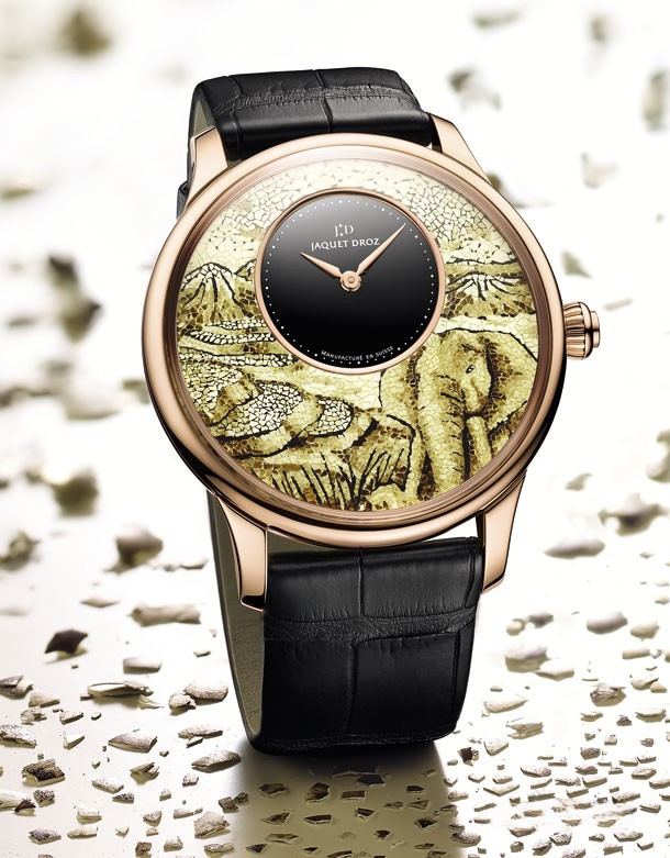 Азиатская техника мозаики из яичной скорлупы была перенесена Jaquet Droz в мир часового искусства для модели, которую можно назвать шедевром миниатюризации. На циферблате новой модели из коллекции Petite Heure Minute, воплощающей в себе инновационные методы отделки и эстетические традиции Jaquet Droz, на фоне рисовых полей изображен слон, символ мудрости и силы. Талантливым мастерам удалось решить довольно сложную задачу – декорировать миниатюрной мозаикой циферблат модели Petite Heure Minute диаметром 43 мм и с ювелирной точностью выполнить из скорлупы перепелиных яиц изысканный мотив. Для этого крошечные фрагменты яичной скорлупы – очень хрупкого материала – были отсортированы вручную по цвету, форме и качеству, а затем из более чем 2000 кусочков, имеющих различные очертания и окраску, так же вручную на циферблате из розового золота был выложен рисунок. С обратной стороны часы также украшены декоративной отделкой в виде гравировки на роторе из розового золота 916 пробы. Модель, оснащенная механизмом с автоматическим подзаводом и двойным барабаном, выпущена ограниченной серией из 8 экземпляров. Это уникальное изделие воплощает в себе творческую смелость и любовь к путешествиям, присущие Jaquet Droz, а также эстетические традиции коллекции Ateliers d'Art.