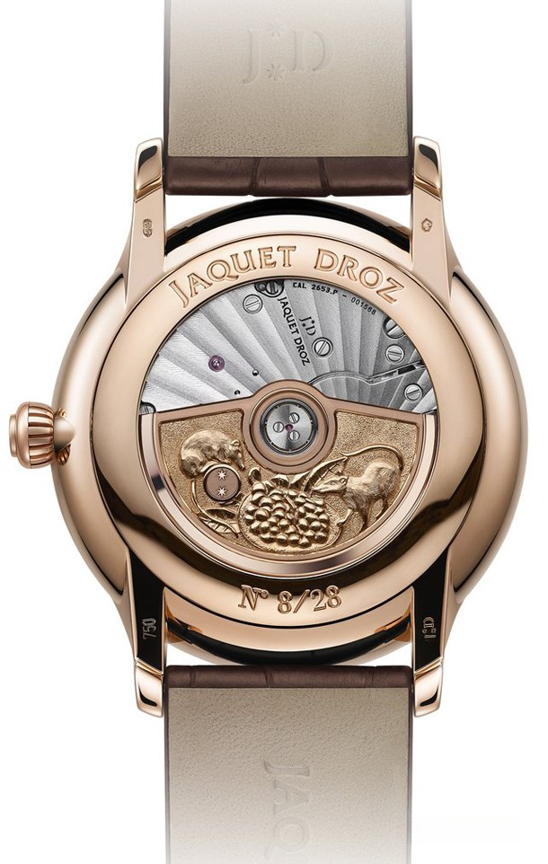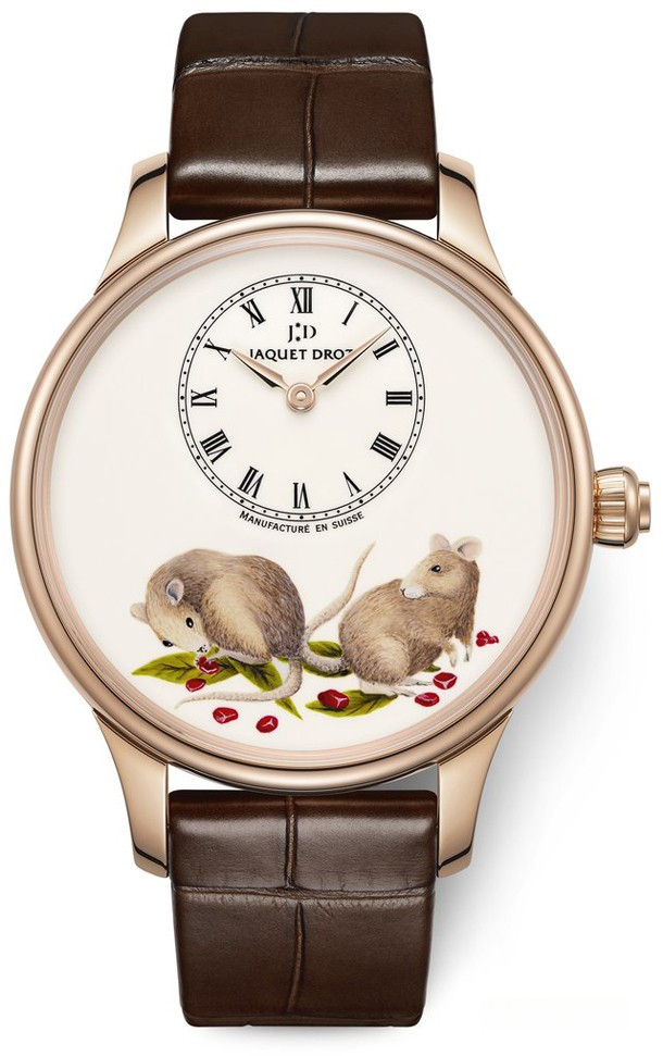 Часы Jaquet Droz Petite Heure Minute Rat представлены в корпусе из розового золота 18к размером 39 х 12.23 мм водонепроницаемостью 30 метров. Циферблат цвета слоновой кости выполнен в технике горячей эмали с художественной миниатюрой. Механизм с автоматическим подзаводом, Калибр Jaquet Droz 2653.P. Запас хода 68 часов. Ограниченная серия из 28 экземпляров. Часы поставляются на ремешке из кожи аллигатора с вставкой из розового золота 18к.