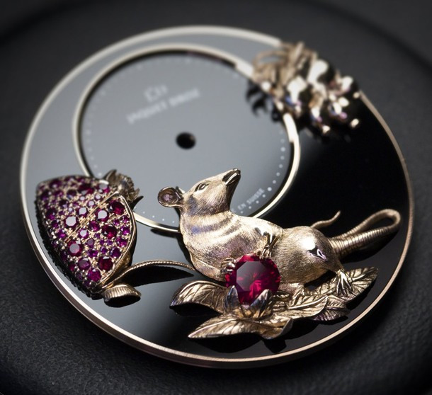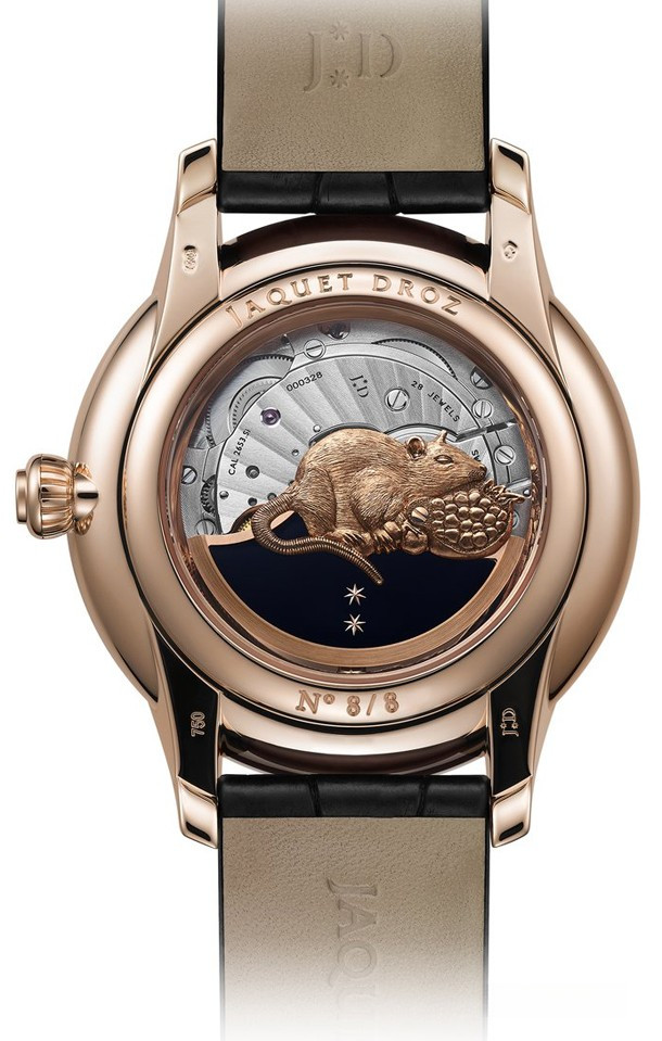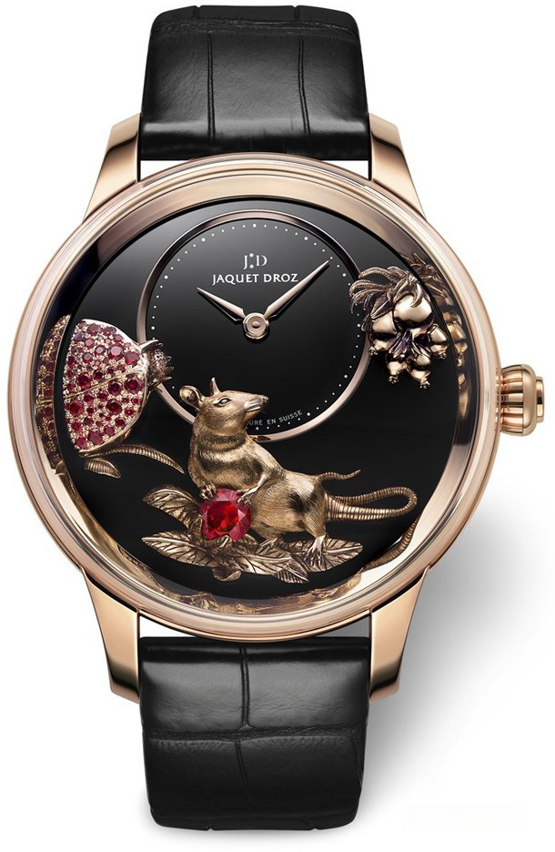 Часы Jaquet Droz Petite Heure Minute Relief Rat представлены в корпусе из розового золота 18к размером 41 х 13.77 мм и водонепроницаемостью 30 метров. Внутри корпуса установлен автоматический механизм, Калибр Jaquet Droz 2653.Si, обладающий запасом хода 68 часов. На черном циефрблате с гравюрой крысы и красными рубинами отображаются часы и минуты. Часы комплектуются ремешком из кожи аллигатора с вставкой из розового золота 18к. Серия ограничена - 8 шт.