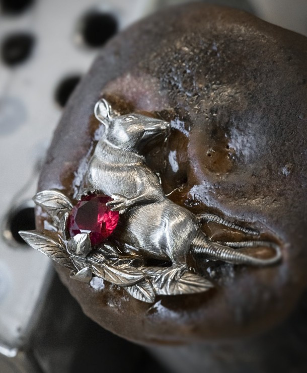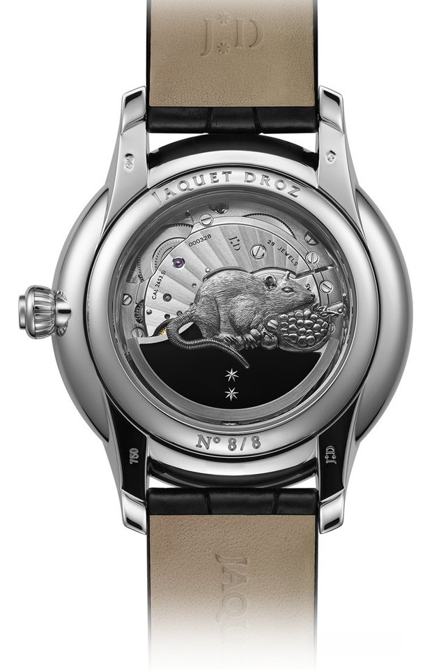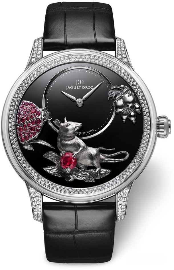 Часы Jaquet Droz Petite Heure Minute Relief Rat представлены в корпусе из белого золота 18к размером 41 х 13.77 мм и водонепроницаемостью 30 метров. Внутри корпуса установлен автоматический механизм, Калибр Jaquet Droz 2653.Si, обладающий запасом хода 68 часов. На черном циефрблате с гравюрой крысы и красными рубинами отображаются часы и минуты. Часы комплектуются ремешком из кожи аллигатора с вставкой из белого золота 18к. Корпус инкрустирован белыми бриллиантами. Серия ограничена - 8 шт.
