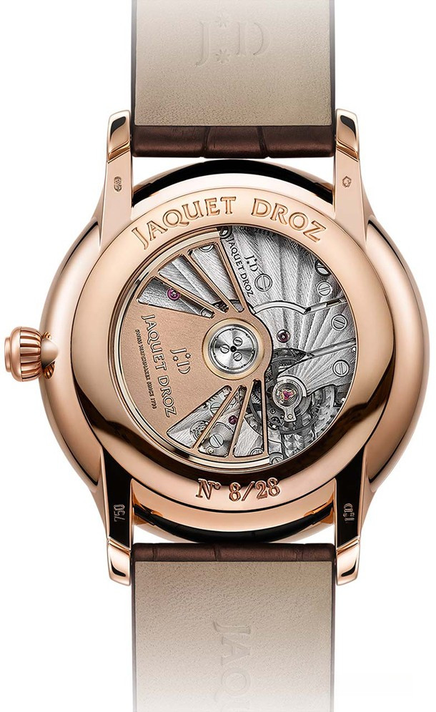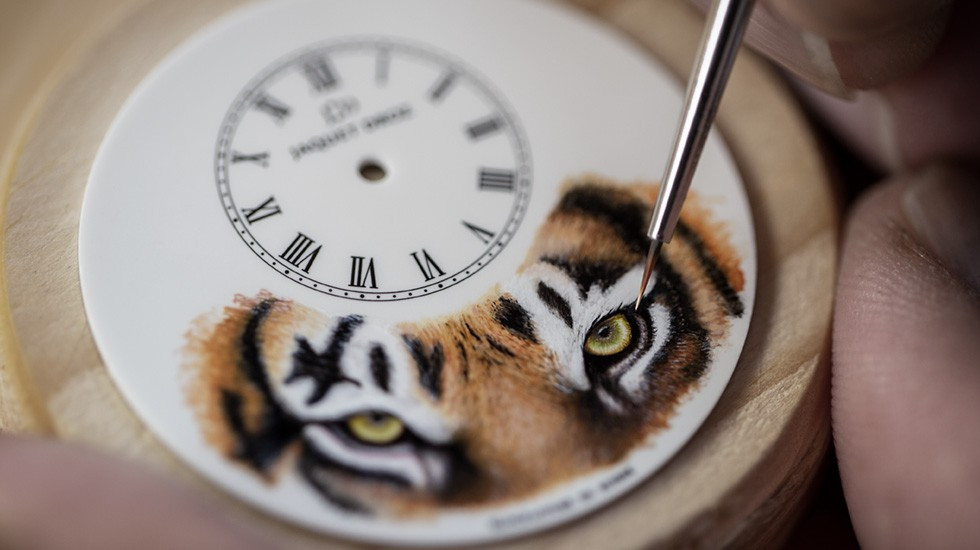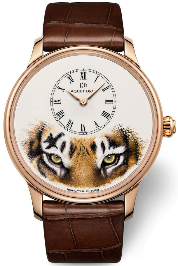 В новых часах Petite Heure Minute Tiger бренд Jaquet Droz объединяет сущность часового искусства и художественного опыта. Часы выпущены ограниченной серией 28 штук. На циферблате изображен тигр. Размер корпуса составляет 43 мм, толщина – 12.06 мм. Часы Jaquet Droz Petite Heure Minute Tiger комплектуются автоматическим механизмом, Калибр 2653.P с балансовой частотой 28 800 пк/час, или 4 Гц. Этот механизм имеет двойной барабан, обеспечивающий запас хода 68 часов. Красивая отделка и ротор из 18-каратного золота видны через прозрачную заднюю крышку из сапфирового стекла.