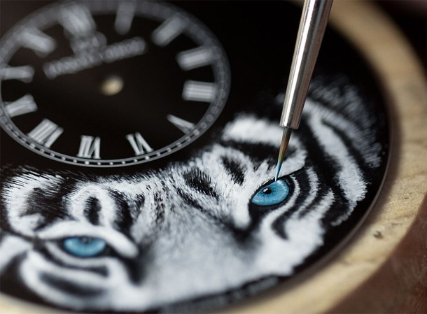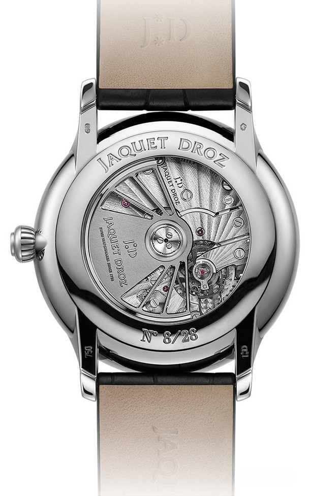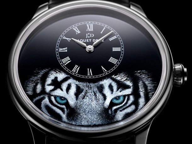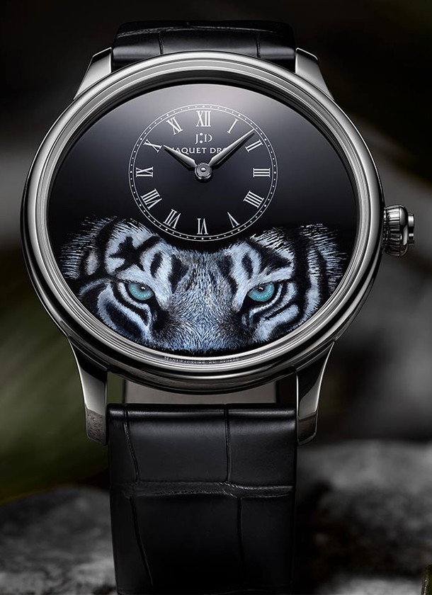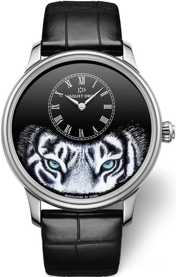 В новых часах Petite Heure Minute Tiger бренд Jaquet Droz объединяет сущность часового искусства и художественного опыта. Часы выпущены ограниченной серией 28 штук. На циферблате изображен тигр. Размер корпуса составляет 43 мм, толщина – 12.06 мм. Часы Jaquet Droz Petite Heure Minute Tiger комплектуются автоматическим механизмом, Калибр 2653.P с балансовой частотой 28 800 пк/час, или 4 Гц. Этот механизм имеет двойной барабан, обеспечивающий запас хода 68 часов. Красивая отделка и ротор из 18-каратного золота видны через прозрачную заднюю крышку из сапфирового стекла.