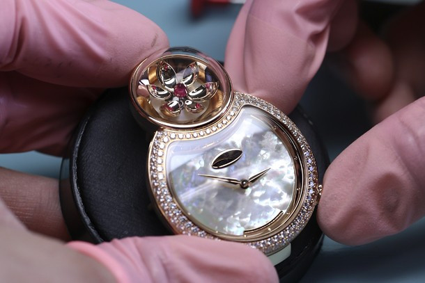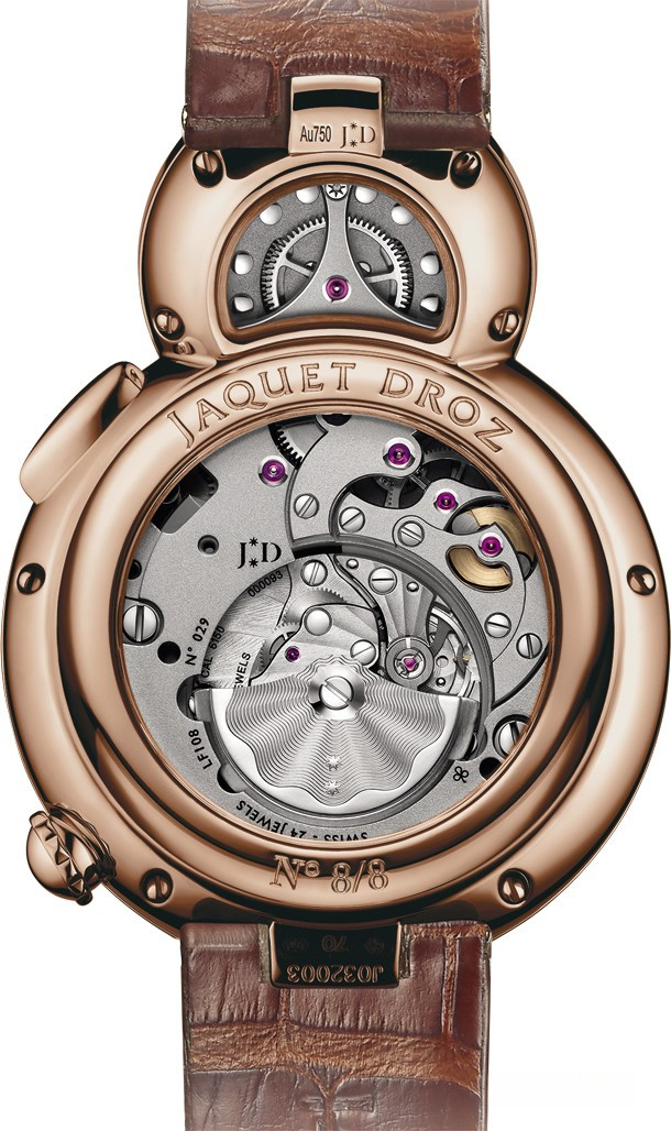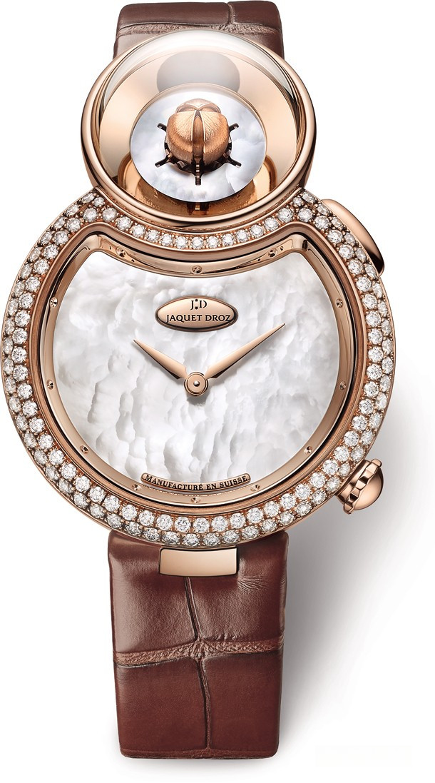 Новая версия модели Lady 8 Flower, выполненная в соответствии со стилистическими канонами Дома Jaquet Droz и украшенная автоматоном в виде цветка лотоса, распускающегося при нажатии кнопки, олицетворяет собой союз эстетического и технического совершенства. Циферблат белый жемчужный. Корпус из розового золота 750 пробы инкрустирован бриллиантами. Запас хода 38 часов. Диаметр 35 мм. Ограниченная серия из 8 экземпляров. Механизм автоматона в виде открывающегося цветка. 24 рубина. Лепестки из розового золота 750 пробы с ручной гравировкой и отделкой эмалью. Вращающийся в двух направлениях бриллиант огранки «бриолет» (0,24 карата). Управление автоматоном с помощью кнопки напротив метки «2 часа». Jaquet Droz 615, механизм с автоматическим подзаводом, один барабан. Баланс с регулировочными винтами и спираль из кремния. Ротор из платины.