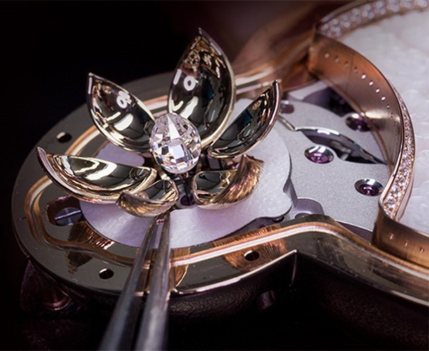 Корпус из розового золота 18к инкрустирован белыми бриллиантами. Автоматон в виде распускающегося цветка. Лепестки из розового золота 18к. Вращающийся в двух направлениях бриллиант в форме бриолет весом 0,24 карата. Механизм с автоматическим подзаводом с индикацией часов и минут. Запас хода 38 часов. Диаметр 35 мм. Ограниченная серия из 8 экземпляров. 24 камня. Специальная кнопка для прямого включения автоматона вручную у отметки «2 часа».