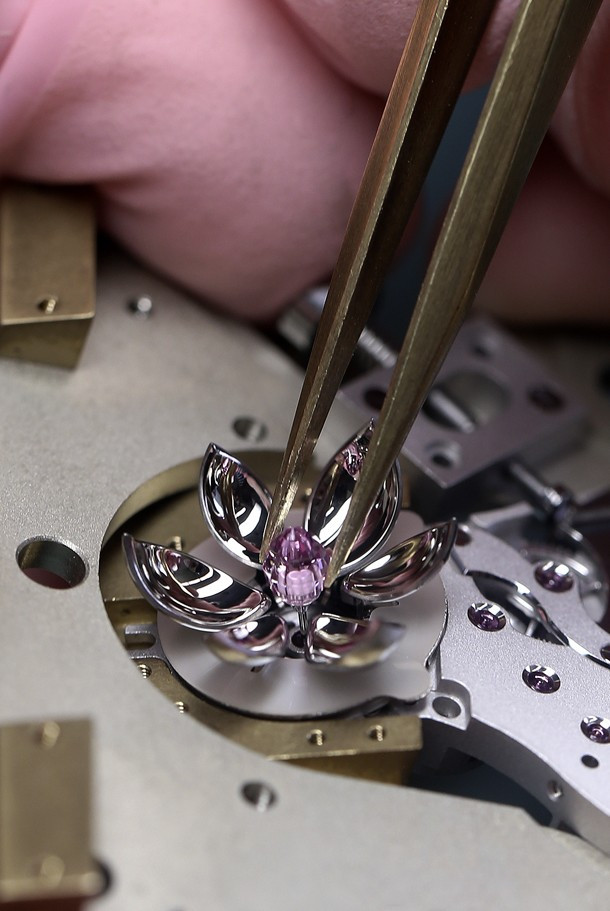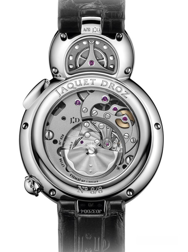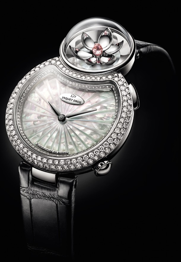 Новая версия модели Lady 8 Flower, выполненная в соответствии со стилистическими канонами Дома Jaquet Droz и украшенная автоматоном в виде цветка лотоса, распускающегося при нажатии кнопки, олицетворяет собой союз эстетического и технического совершенства. Циферблат белый жемчужный. Корпус из белого золота 750 пробы инкрустирован бриллиантами. Запас хода 38 часов. Диаметр 35 мм. Ограниченная серия из 8 экземпляров. Механизм автоматона в виде открывающегося цветка. 24 рубина. Лепестки из белого золота 750 пробы с ручной гравировкой и отделкой эмалью. Вращающийся в двух направлениях бриллиант огранки «бриолет» (0,24 карата). Управление автоматоном с помощью кнопки напротив метки «2 часа». Jaquet Droz 615, механизм с автоматическим подзаводом, один барабан. Баланс с регулировочными винтами и спираль из кремния. Ротор из платины.