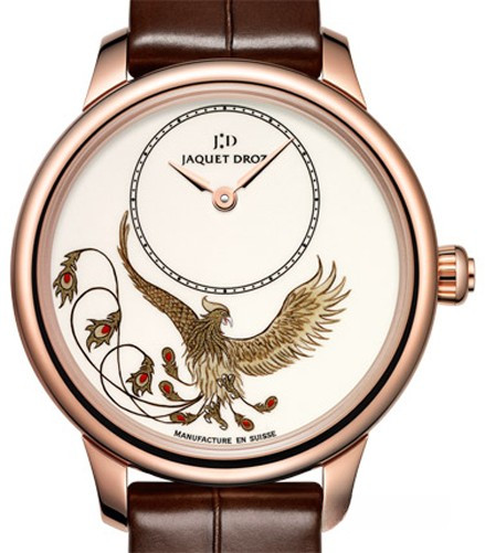 Часы Jaquet Droz Les Ateliers d`Art Painting on Enamel J005003201 обладают круглым корпусом из 18-каратного розового золота, диаметром 35 мм, водонепроницаемостью до 30 м. Рифленая заводная головка расположена на отметке 3 часа. Сапфировое стекло установлено на передней стороне часового корпуса (с антибликовым покрытием) и на его завинчивающейся задней крышке. Циферблат белого цвета, с мотивом 'Феникс', со стрелками золотистого цвета. Модель оснащена мануфактурным швейцарским автоматическим механизмом. Калибр с 68-часовым запасом хода, с функциями индикации часов и минут. Калибр отменно отделан и декорирован. Поставляется на ремешке из кожи аллигатора с вставкой из 18-каратного розового золота. Модель выпускается ограниченной серией в количестве 88 экземпляров.