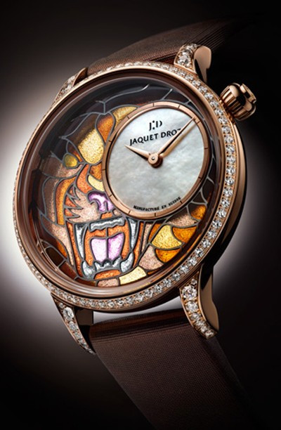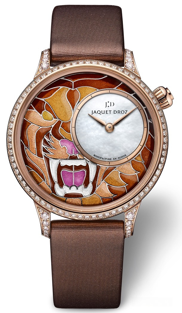 Jaquet Droz в первый раз использует ломкую эмаль, или «smalta clara» на латыни. Композиция циферблата состоит не из монолита эмали, а скорее из ячеек разной формы и цвета. Ячейки разделены золотой проволокой. Без металлической основы композиция представляет собой отдельную деталь, похожую на витражное окно. Когда на композицию попадает луч света, внезапно возникает полный мотив: тигр, разработанный исключительно Jaquet Droz для этой модели часов. Лев изображен яркими, современными штрихами, усиливая нежное качество женской модели с сильной индивидуальностью. Каждый циферблат включает не менее семи оттенков для создания реалистичного тигра. Часы Petite Heure Minute Smalta Clara обладают смещенным к двум часа циферблатом. Petite Heure Smalta Clara выпускается ограниченной серией из 28 штук. Диаметр корпуса часов составляет 35 мм, ушки и безель инкрустированы белыми бриллиантами. Часы комплектуются сатиновым ремешком, идеально подобранным по цвету к циферблату.