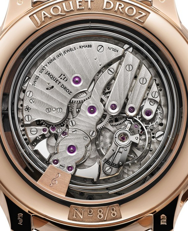 Модель Jaquet Droz Bird Repeater пропитана духом Женевы, изображенной на заднем плане цифеблата. В оформлении циферблата приняли участие гравировщики, художники и эмальеры. Каждый из мастеров оставил свой профессиональный отпечаток в изображении Женевского озера, его знаменитого фонтана Уотер Фонтейн и маяка (Le Phare Des Paquis), а также силуэта горы Salève, пика в предгорьях Альп, признанным символом города. Более заметной на циферблате является пара элегантных щеглов, скульптура, выполненная вручную из золота с ярким оперением. В гнезде сидят двое их птенцов и одно инкубационное яйцо. Все создано руками весьма и весьма квалифицированных мастеров. В соответствии с предыдущими версиями, Bird Repeater Geneva может похвастаться примером анимации, миниатюрным, но впечатляющим: птицы, кормящие своих птенцов и раскрывающие крылья, поток воды, инкубационное яйцо – и всё это в честь знаменитого автоматона, созданного Пьером Жаке-Дро и его сыном в 18 веке. Часовой механизм Jaquet Droz RMA88 с автоматическим заводом имеет потрясающую отделку и полностью виден сквозь заднюю часть корпуса. Снизу расположены отполированные до зеркального блеска ударные молоточки. Также, как и в предыдущих моделях Bird Repeater, тираж Bird Repeater Geneve будет составлять только 8 единиц, каждая в корпусе из розового золота 18к диаметром 47 мм.