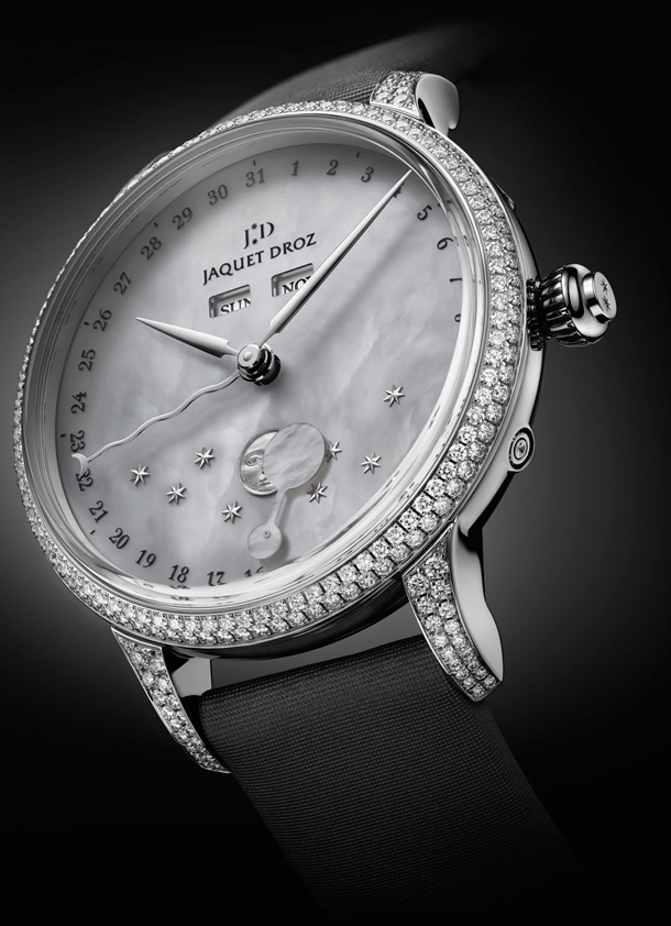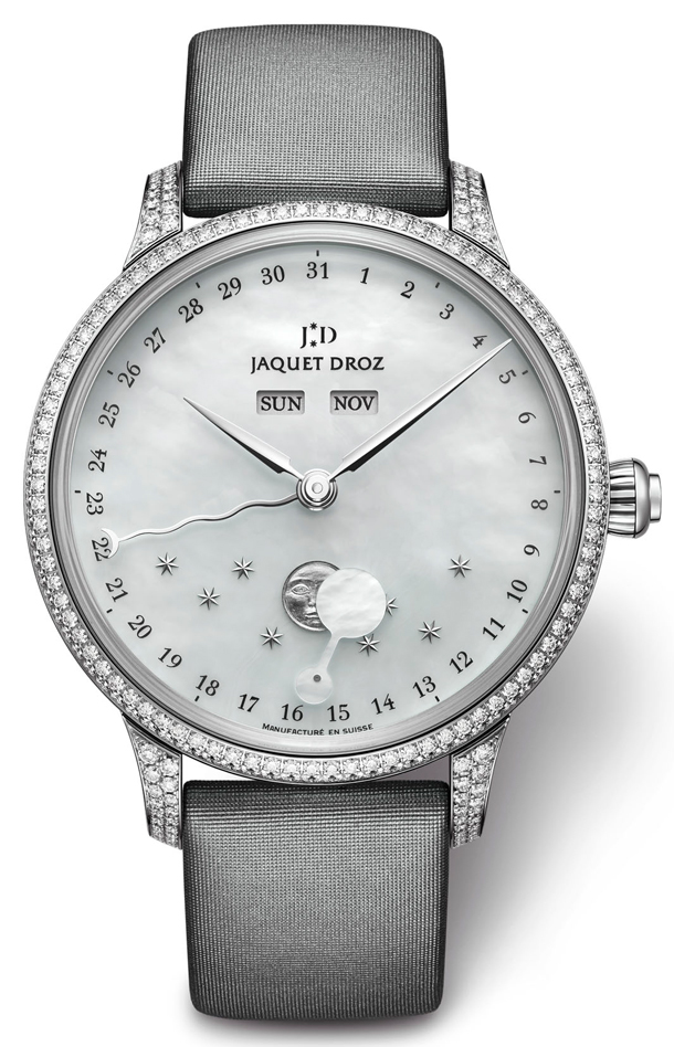 Часы Jaquet Droz Magestic Beijing The Eclipse and the Moons J012614570 обладают круглым корпусом из 18-каратного белого золота, размеры которого составляют 39 х 12.7 мм, водонепроницаемостью до 30 м. Корпус инкрустирован белыми бриллиантами. Рифленая заводная головка расположена на отметке 3 часа. Сапфировое стекло установлено на передней стороне часового корпуса (с антибликовым покрытием) и на его завинчивающейся задней крышке. Циферблат жемчужный, белого цвета, со стрелками серебристого цвета. Модель оснащена мануфактурным швейцарским автоматическим механизмом. Калибр Jaquet Droz 6553L2 с 68-часовым запасом хода, с функциями индикации часов, минут, даты, дня недели, месяца, фазы луны. Астрономические часы. Калибр отменно отделан и декорирован. Поставляется на атласном ремешке с вставкой из 18-каратного белого золота.