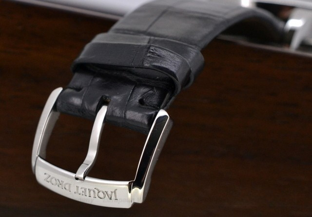 Часы Jaquet Droz Magestic Beijing Grande Heure Minute J017010201 обладают круглым корпусом из нержавеющей стали, диаметром 41 мм, водонепроницаемостью до 30 м. Рифленая заводная головка расположена на отметке 3 часа. Сапфировое стекло установлено на передней стороне часового корпуса (с антибликовым покрытием) и на его завинчивающейся задней крышке. Циферблат серого цвета со стрелками серебристого цвета. Модель оснащена мануфактурным швейцарским автоматическим механизмом. Калибр Jaquet Droz 1169 с 68-часовым запасом хода, функциями индикации часов, минут и секунд. Калибр отменно отделан и декорирован. Поставляется на ремешке из кожи аллигатора с вставкой из нержавеющей стали. Модель выпускается ограниченной серией в количестве 88 экземпляров.