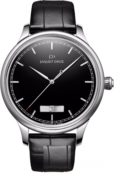 Часы Jaquet Droz Grande Heure Minute Quantieme изготовлены в корпусе из нержавеющей стали размером 39 х 11.09 мм и водонепроницаемостью 30 метров. На циферблате из черного оникса отображаются часы, минуты, секунды, дата. Внутри корпуса установлен автоматический механизм Jaquet Droz 1150.P с запасом хода 68 часов. Часы комплектуются ремешком из кожи аллигатора с вставкой из нержавеющей стали.
