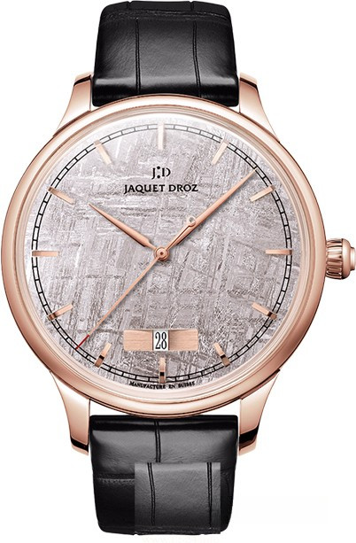 Часы Jaquet Droz Grande Heure Minute Quantieme изготовлены в корпусе из розового золота 18к размером 39 х 11.09 мм и водонепроницаемостью 30 метров. На циферблате из серого метеорита отображаются часы, минуты, секунды, дата. Внутри корпуса установлен автоматический механизм Jaquet Droz 1150.P с запасом хода 68 часов. Часы комплектуются ремешком из кожи аллигатора с вставкой из розового золота 18к.