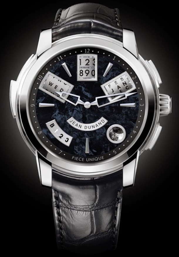 Корпус круглой классической формы с полированной поверхностью обладает размером 47 х 17.65 мм и водонепроницаемостью до 30 метров. Рифленая заводная головка расположена на 3 часах, на торце корпуса находится кнопка для установки месяцев и високосного года, кнопка для установки показателей календаря - на 4 часах, а отдельно для установки дня недели - на 2 часах, кнопка для установки фаз Луны - на 5 часах, рычаг запуска минутного репетира - на 9 часах. Сапфировое стекло защищает циферблат с накладными часовыми индексами, а также со скелетонизированными часовой и минутной стрелками. Часы комплектуются мануфактурным швейцарским механизмом с ручным заводом Christophe Claret CLA88QPRM, состоящим из 721 детали (в том числе - 54 камней), диаметром 29,50 мм, общей высотой (вместе с циферблатом и дисплем 12,19 мм), регулятором "лебединая шея", с балансовой частотой 18000 полуколебаний в час (2,5 гц), 45-часовым запасом хода, функциями индикации часов, минут (посредством соответствующих центральных стрелок), даты (посредством соответствующего цифрового двухцилиндрового указателя в крупной прямоугольной апертуре, расположенной на 12 часах), дня недели (посредством соответствующего цифрового цилиндрового указателя в крупной прямоугольной апертуре, расположенной на 10 часах), месяца (посредством соответствующего цифрового цилиндрового указателя в крупной прямоугольной апертуре, расположенной на 2 часах), високосного года (посредством соответствующего цифрового указателя, расположенной между 7 и 8 часами), фаз Луны (посредством соответствующего указателя в круглой апертуре, расположенной между 4 и 5 часами), а также с репетиром с двумя гонгами, вызванивающем часы, четверти часов и минуты. Калибр отменно отделан и декорирован. Часы Jean Dunand Shabaka поставляются на черном ремешке из кожи аллигатора с соответствующей корпусу застежкой.
