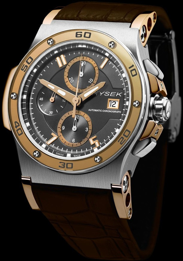 Часы Abyss 44 mm Chronograph представлены в корпусе из титана и розового золота 18к диаметром 44 мм. Они оснащены системой поворотных выступов, разработанной мануфактурой, что позволяет часам естественно размещаться на запястье. Выступы и боковые протекторы изготовлены из розового золота. Модель укомплектована швецарским механизмом с автоматическим подзаводом с 42-часовым запасом хода. На обширном 44-миллиметровом циферблате чередуются полированные и матовые участки, а в центре установлены две широкие часовая и минутная стрелки, покрытые материалом Super-LumiNova. Каждая стрелка хронографа на секундном, 30-минутном и часовом счетчиках, а также пятиминутные маркеры имеют покрытие из того же люминофора. Для всех настроек времени используется одна ввинченная коронка. Часы комплектуются ремешком из кожи аллигатора с титановой вставкой.