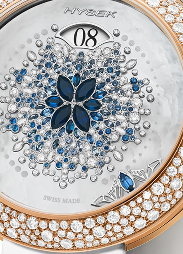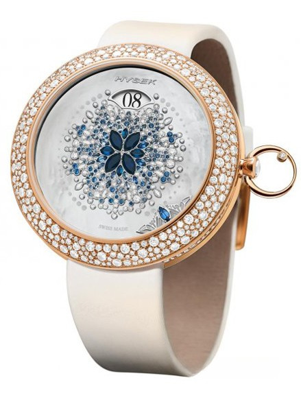 Часы Hysek Kalysta Snowflake представлены в корпусе из розового золота 18к размером 39 х 11 мм и водонепроницаемостью 30 метров. Внутри корпуса установлен автоматический механизм с запасом хода 39 часов. На белом жемчужном циферблате с белыми бриллиантами и синими сапфирами отображаются часы, минуты. Часы поставляются на сатиновом ремешке с вставкой из розового золота 18к. Безель из белых бриллиантов, серия ограничена (32 шт.)