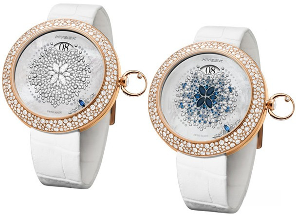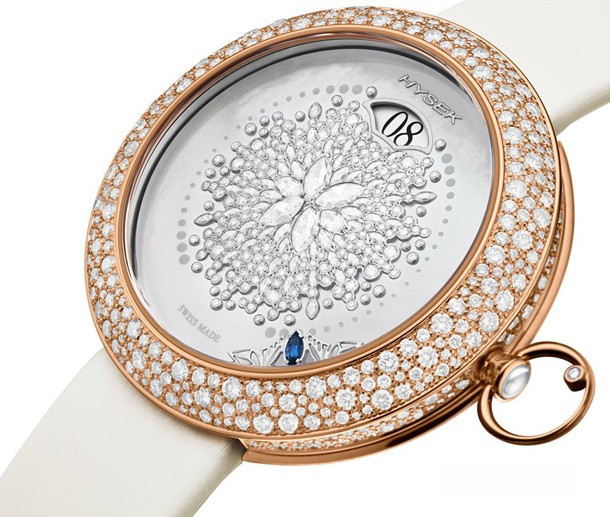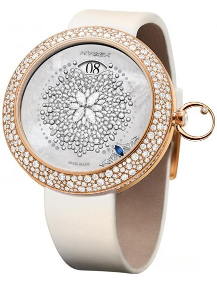 Часы Hysek Kalysta Snowflake представлены в корпусе из розового золота 18к размером 39 х 11 мм и водонепроницаемостью 30 метров. Внутри корпуса установлен автоматический механизм с запасом хода 39 часов. На белом жемчужном циферблате с белыми бриллиантами отображаются часы, минуты. Часы поставляются на сатиновом ремешке с вставкой из розового золота 18к. Безель из белых бриллиантов, серия ограничена (32 шт.)