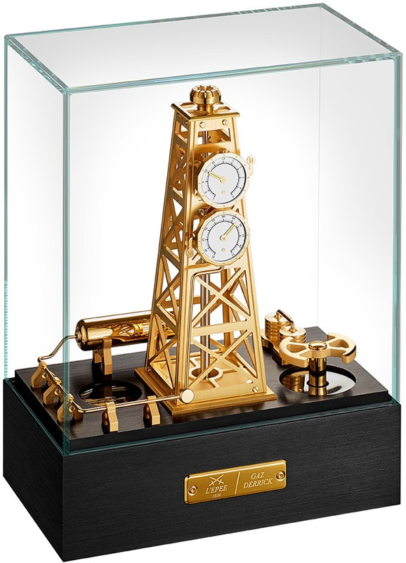 Часы L’Epee1839 Gaz Derrick оснащены новым механизмом с запасом хода 7 дней, который имеет 2 циферблата в форме и стиле газовых датчиков, каждый из них отображает часы и минуты. Запас хода 7 дней, 11 камней. Размеры: 17.8 х 10 х 23.3 см, вес 3,2 кг. Лимитированный выпуск. Производство Швейцария.
