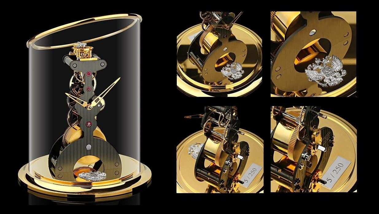 Настольные часы L’Epee1839 La Tour Russian Time. Механизм с ручным заводом, запас хода 8 дней, 18 камней. Полированная латунь, покрытие - золото, палладий. Высота 150 мм, диаметр 120 мм. На платформе часов размещен герб России. Так же под заказ можно разместить логотип компании и т.д. Производство Швейцария.