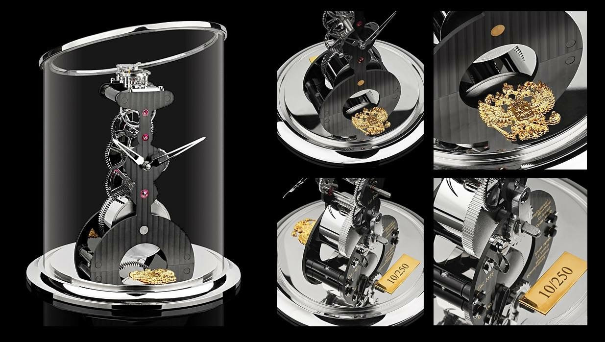 Настольные часы L’Epee1839 La Tour Russian Time. Механизм с ручным заводом, запас хода 8 дней, 18 камней. Полированная латунь, покрытие - золото, палладий. Высота 150 мм, диаметр 120 мм. На платформе часов размещен герб России. Так же под заказ можно разместить логотип компании и т.д. Производство Швейцария.