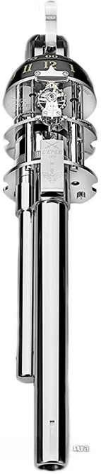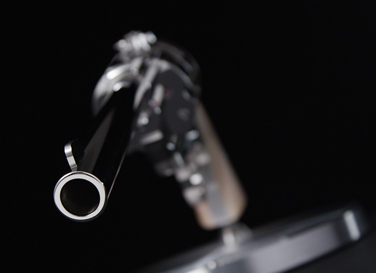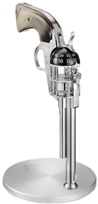 Настольные часы L’Epee1839 Pistol. Запас хода 8 дней,17камней. Латунь с палладиевым покрытием, нержавеющая сталь. Вес: пистолет: 2 кг + основание: 1,3 кг. Размеры: длина 350 мм, ширина 172 мм, основание: диаметр 60,5 мм. Лимитированный выпуск. Производство Швейцария.