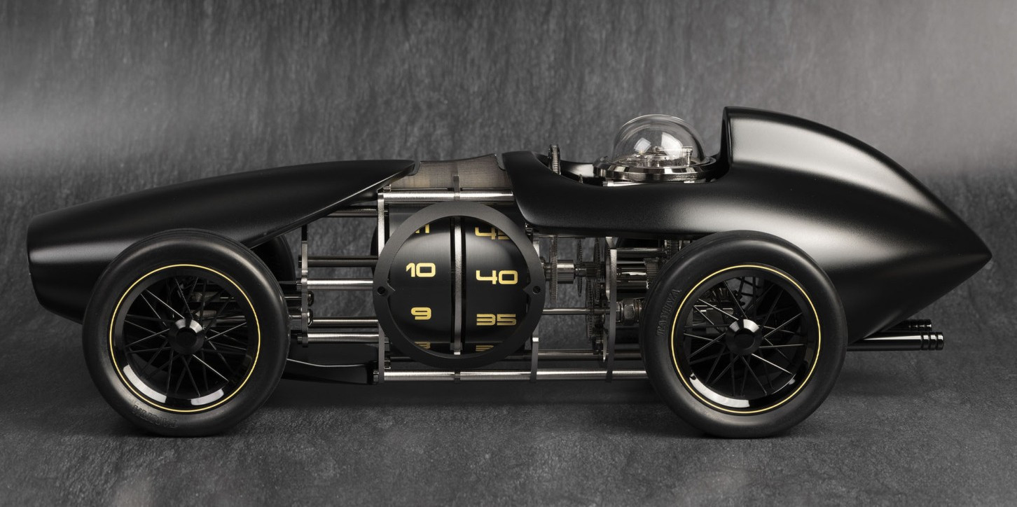 Настольные часы L’Epee 1839 Time Fast D8 Black. В этой кинетической скульптуре объединены дизайн гоночного ретроавтомобиля и современные настольные часы. Запас хода 8 дней, 26 камней. Размер 38,5 см x 16 см x 12 см. Вес 4,7 кг. Лимитированная серия – 5 шт. Производство Швейцария.