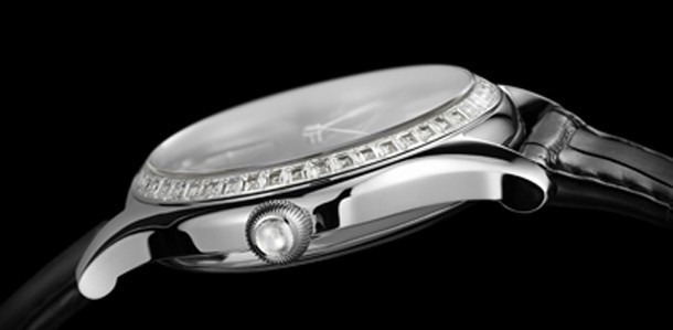 водонепроницаемость 30 м, безель из 48-ми белых багетных бриллиантов общим весом 3 ct.