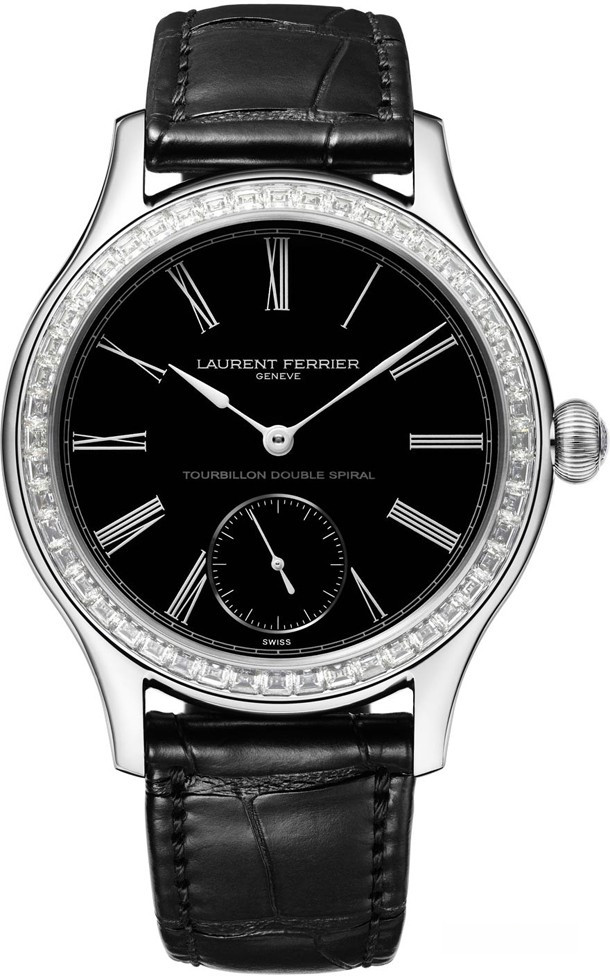 Часы Galet Classic Tourbilllon Double Spiral, инкрустированные бриллиантами, выпущены в 41-миллиметровом корпусе из 18-каратного белого золота и укомплектованы циферблатом из черного оникса. Частота составляет 21 600 полуколебаний / час, а запас хода - 80 часов. Модель оснащена черным ремешком из кожи аллигатора с золотой застежкой. Модель Galet Classic Tourbilllon Double Spiral украшает яркий венец из 48-ми бриллиантов багетной огранки общим весом 3 карата. Практически незаметная инкрустация в действительности представляет собой очень сложный процесс, в результате которого бриллианты, как будто по мановению волшебной палочки удерживаются на месте и тем самым обеспечивают идеальную гармонию вокруг безеля. Камни обращены к сапфировому стеклу, дополняя его. Калибр Tourbillon Double Spiral с ручным подзаводом представляет собой эксклюзивный механизм Laurent Ferrier, который знаменит своей концепцией двух балансовых пружин, связанных по системе голова-к-хвосту. Это устройство работает как выравниватель эффекта гравитации, поддерживает центр тяжести баланса в соответствии с его осью.