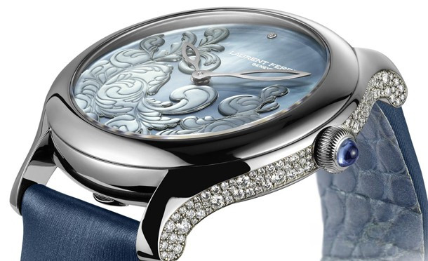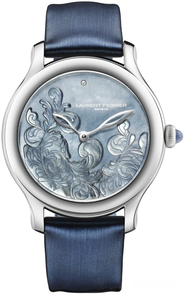 Бывший часовщик Patek Philippe Лоран Ферье решил обратить символическую модель Galet Micro-Rotor в их женскую интерпретацию. Механизм остался неизменным и верным строгим требованиям Laurent Ferrier. Между тем, округлый 39 мм-вый корпус обеспечивает более плотный охват, а также чувство большего комфорта на дамском запястье. Для циферблата Laurent Ferrier выбрал перламутр, который излучает уникальное бархатистое ощущение из-за его природных свойств. Он обогащен стилизованным декором с изящным мотивом арабески. Чистый лаконичный циферблат украшен бриллиантом в позиции 12 часов для повышения уровня читабельности. Боковая часть корпуса украшена паве из драгоценных камней общим весом 1,4 карат.