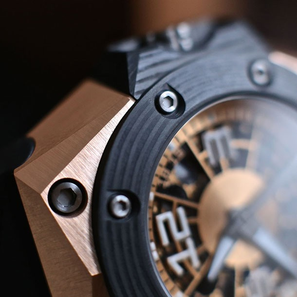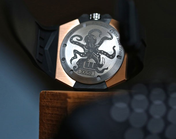 Изюминкой модели Oktopus Moon является ее корпус. Разработка корпуса – это чрезвычайно кропотливое занятие, которое осуществляется путем интенсивного применения процесса, который называется 3DTP (иначе известное как 3-мерное тонкое конструирование - 3-Dimensional Thin Ply). Во время данного 3DTP процесса происходит наслаивание углеродного волокна и сплетений в схему точного рисунка. Oktopus Moon Carbon обладают размером корпуса 44 х 15 мм. Учитывая дизайн, такой размер носится очень хорошо. Задняя крышка корпуса демонстрирует прекрасное изображение осьминога и индивидуальный номер модели. Коллекция ограничена 59 экземплярами.
