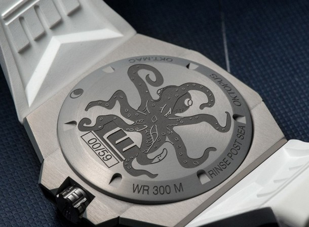Новый безель является важным этапом трансформации. Белая керамика с круговым матированием выделяются и этим самым дополняют корпус ALW, заполняя брешь между белым каучуковым ремешком и матированным серебристо-белым циферблатом и подчеркивая целостность трехмерной конструкции корпуса. Верхний циферблат был переработан и скелетонизирован. Это позволяет владельцу легко читать индикатор фаз Луны и планировать заранее периоды полной Луны. Мануфактурное усложнение фаз Луны в пятислойной структуре циферблата, элементы которого содержат различные типы отделки – небольшая, но существенная деталь. Промежутки между фотореалистичными элементами индикации фаз Луны заполнены жемчужным зернением, демонстрируя сверкающие на свете звезды ночного неба. Игра цвета Oktopus Moon Lite-White создается благодаря особенности корпуса ALW. ALW – аэрокосмический материал, который поглощает и отражает свет, позволяя часам легко приспосабливаться к окружающей среде так же, как это делает их глубоководный тезка, осьминог. Лимитированный тираж часов Oktopus MoonLite-White составляет 59 единиц.