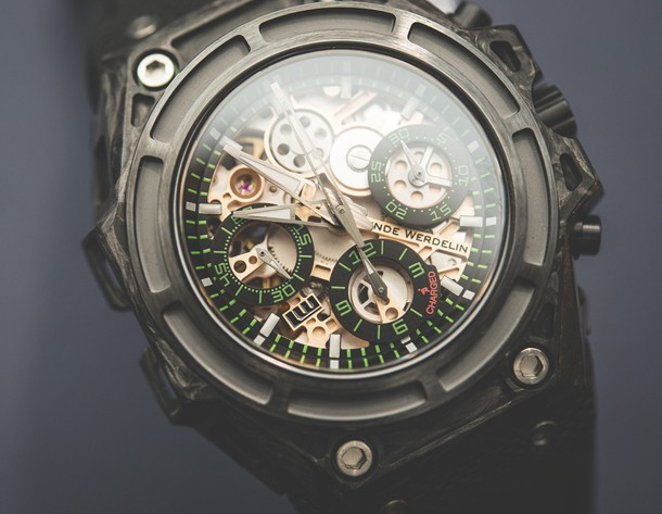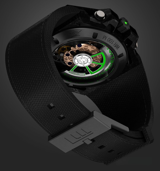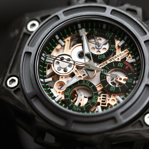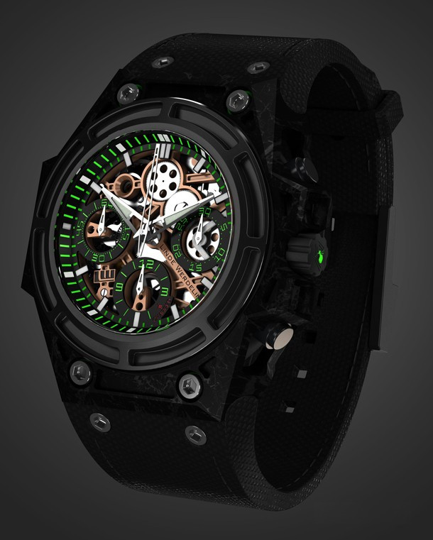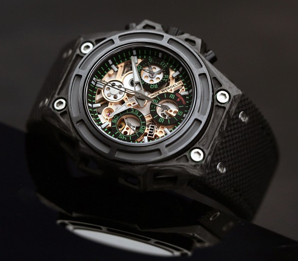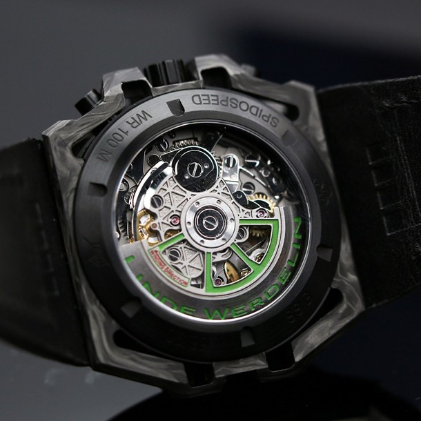 Новые Spidospeed стали более открытыми, показывая подвижные части механизма сквозь новый скелетонизированный циферблат. Важные элементы, такие как шестерни, своим контрастом создают динамический эффект, что облегчает читаемость данных. Циферблат, как и сама структура корпуса, выделяют владельца часов среди толпы. При создании Spidospeed Green использовался кованный карбон и титан. Хронограф сидит на запястье просто замечательно, вопреки крупному диаметру корпуса 44 миллиметра. Часы оснащены сделанным на заказ механизмом “LW06” с выделенными дополнительными акцентами. Модель будет выпущена ограниченным тиражом в количестве 99 штук.