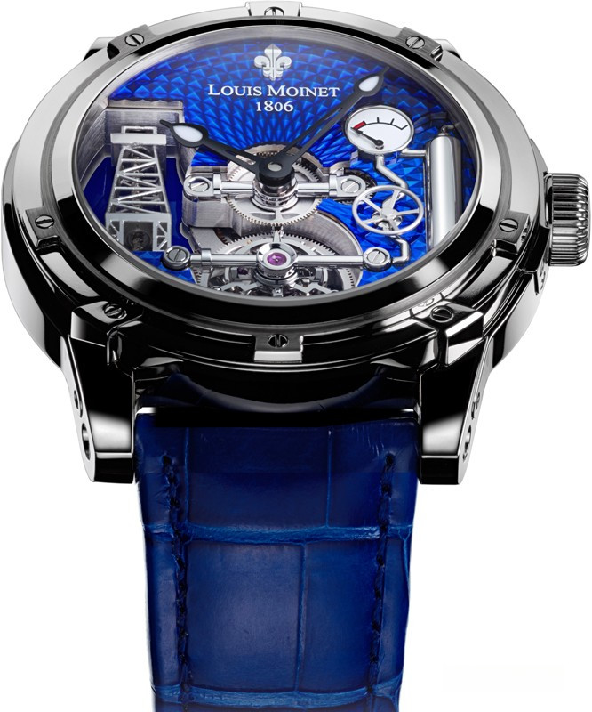 Часы Louis Moinet Derrick Gaz представлены в корпусе из белого золота 18к размером 47 х 14.1 мм и водонепроницаемостью до 30 метров. Сложный Калибр с турбийоном LM42 обладает запасом хода 72 часа. Синий гильошированный циферблат украшает автоматон с нефтяной вышкой. Под сапфировым стеклом расположены центральные часовая и минутная стрелки. Клеть турбийона находится на 6-ти часах. Часы выпущены ограниченной серией 28 штук. Модель комплектуется ремешком из кожи аллигатора с застежкой из белого золота 18к.