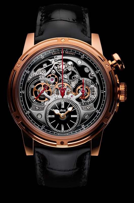 Часы Louis Moinet Memoris представлены в корпусе из розового золота 18 размером 46 х 15.75 мм и водонепроницаемостью до 50 метров. Сложный скелетированный Калибр с функцией хронографа создан в стенах мануфактуры. Автоматический механизм LM79 обладает запасом хода 48 часов. На циферблате расположены накопители хронографа с колонным колесом, смещенные часовая и минутная стрелки на 6-ти часах. Часы выпущены ограниченной серией 12 штук. Модель комплектуется ремешком из кожи аллигатора с золотой застежкой.