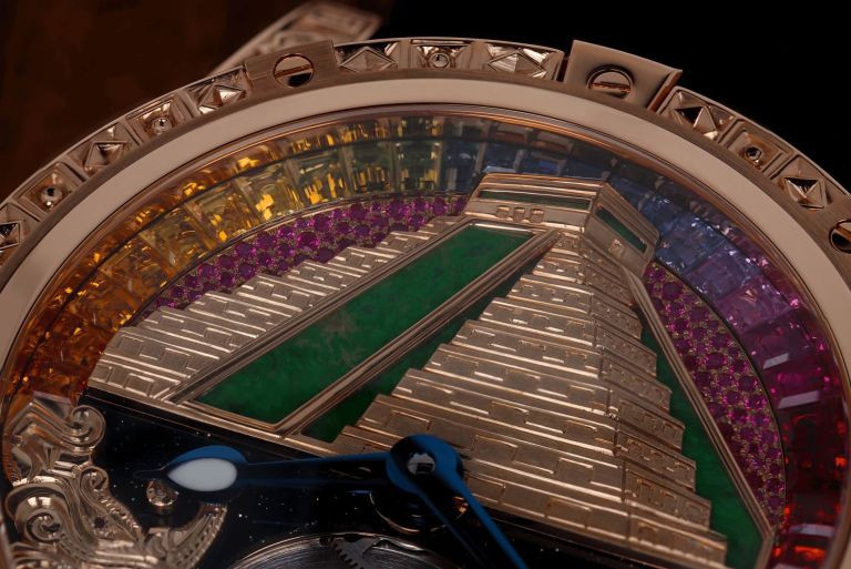 Часы Louis Moinet Wonders of the World Chichenitza Pyramid представлены в корпусе из розового золота 18к водонепроницаемостью 30 метров. Внутри корпуса установлен механизм с ручным заводом. На золотистом циферблате с разноцветными багетными сапфирами и рубинами отображаются часы, минуты. Часы поставляются на ремешке из кожи аллигатора с вставкой из розового золота 18к. Серия ограничена - 1 шт.
