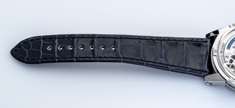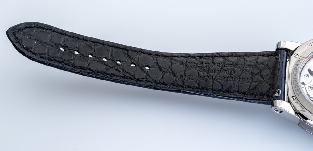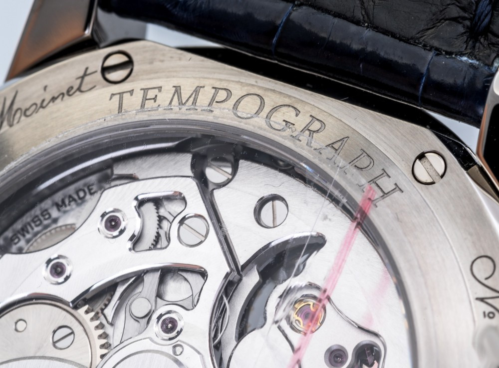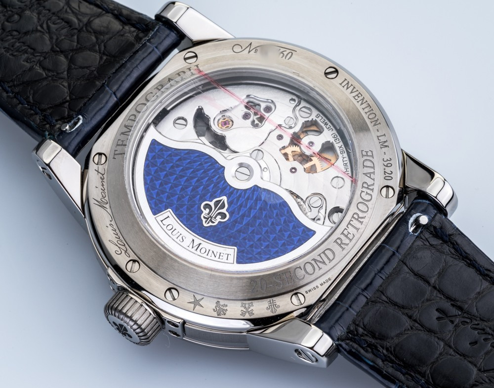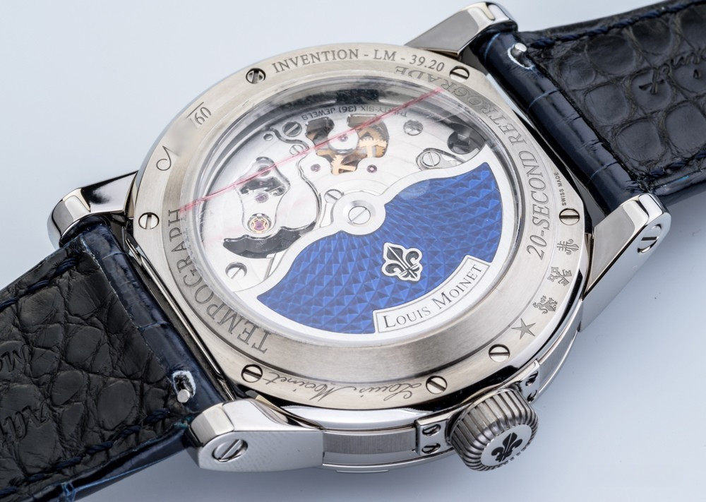 Louis Moinet 20 Second Tempograph изготовлены из титана. Корпус имеет размер 43.5 мм в диаметре и 15.6 мм в высоту. Эта версия Tempograph оснащена синим ремешком из кожи луизианского крокодила. Ремешок удерживается на запястье с помощью раскладывающейся застежки. Безель, который фиксирует сапфировое стекло с высокой устойчивостью к появлению царапин, крепится 5 винтами. Водонепроницаемость составляет 50 метров (5 бар). Внутри корпуса установлен автоматический механизм LM39 с запасом хода 48 часов. Часы выпущены ограниченной серией 60 штук.
