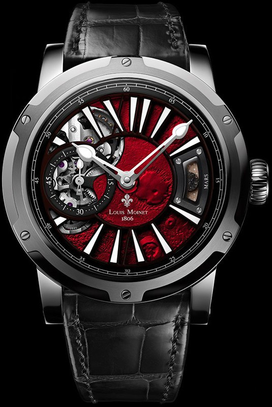Часы Louis Moinet Mars выпущены ограниченной серией 12 штук в корпусе из нержавеющей стали диаметром 45.4 мм, водонепроницаемостью 50 метров. Особенностью часов является осколок метеорита из Марса, который находится в капсуле на 3-х часах на циферблате. Текстура циферблата визуально воспроизводит поверхность планеты с легендарными вулканами Olympus Mons, Ascraeus Mons, Pavonis Mons и Arsia Mons. Модель Mars украшают ажурные часовые метки и стрелки, что придает часам уникальный трехмерный вид. Скелетированный циферблат между 8-ю и 12-ю часами открывает вид на эксклюзивный Калибр Louis Moinet, обеспечивающий балансовую частоту 28 800 пк/час. Малая секундная стрелка расположена на 9-ти часах. Часы поставляются на ремешке из кожи аллигатора.