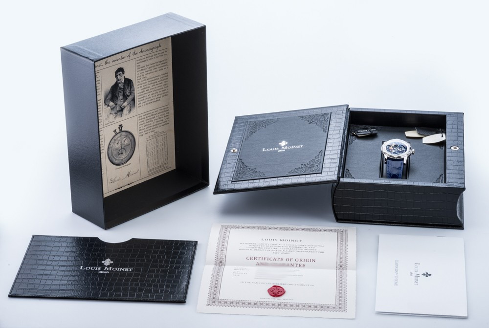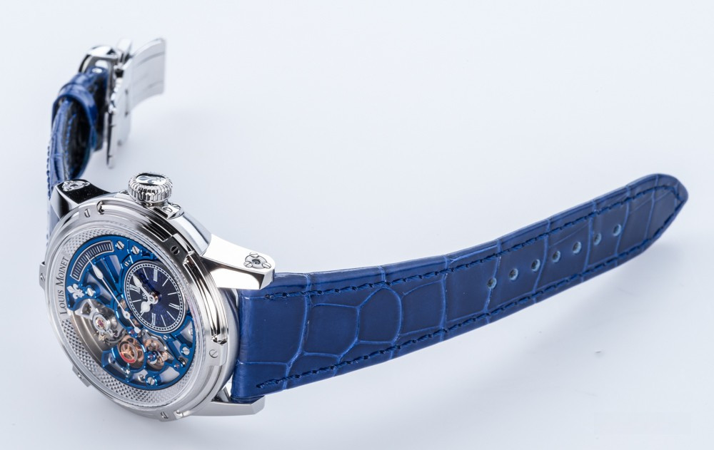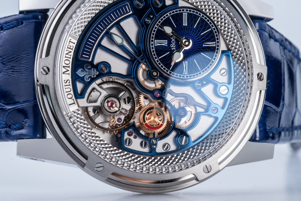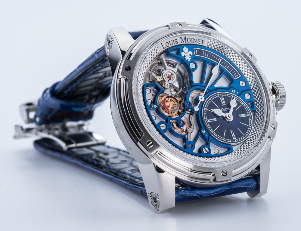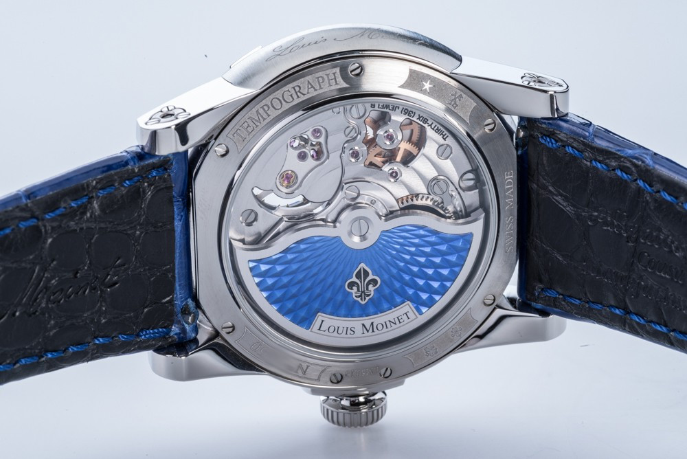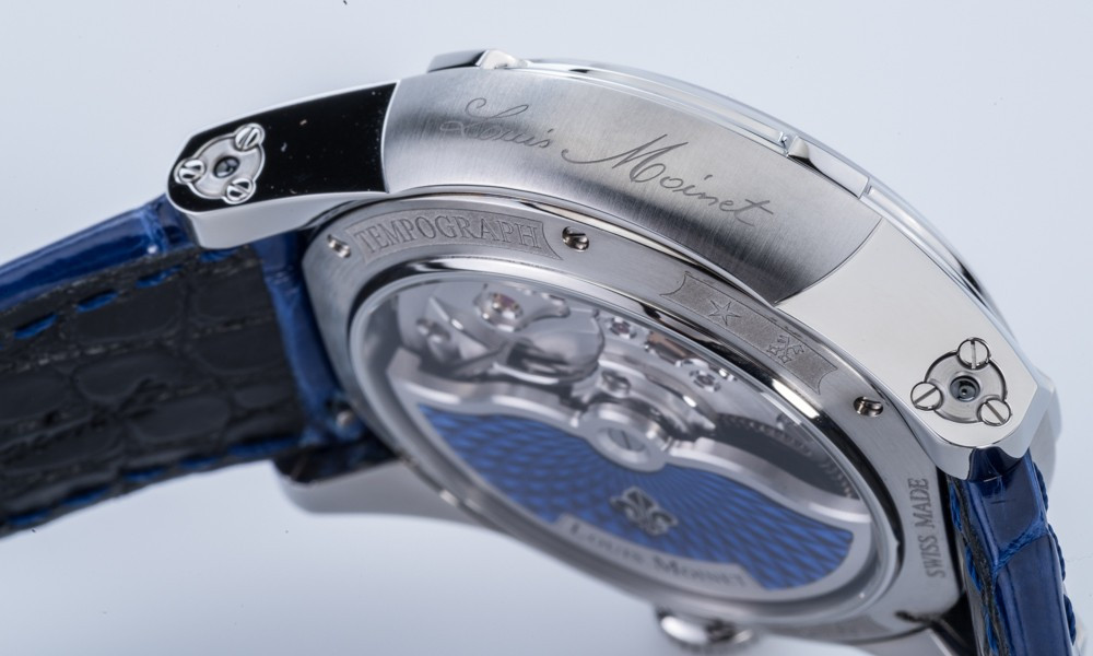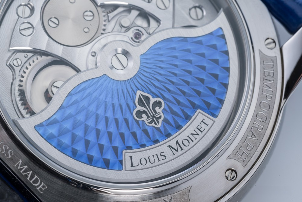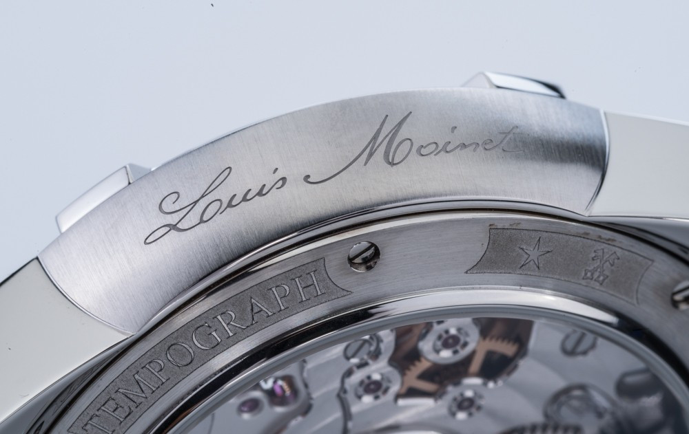 Циферблат 20-Second Tempograph Chrome с часовой и минутной стрелками находится в положении «4 часа»; он также украшен концентрическим рисунком Clou de Paris, ключевым декором для Louis Moinet. Часы также имеют новый корпус, заимствованный из коллекции Memoris, первых хронографов в истории. Насчитывающий 52 компонента, корпус был уменьшен в размере с 46 до 44 миллиметров, а затем полностью переработан, чтобы вместить в себя ретроградный механизм 20-Seconds Tempograph. Это также первый случай, когда престижный корпус выполнен из нержавеющей стали для синей версии.