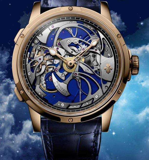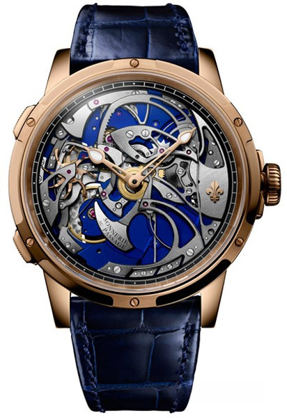 Часы Louis Moinet Ultravox с репетиром представлены в корпусе из розового золота 18к размером 46.5 мм и водонепроницаемостью 30 метров. Внутри корпуса установлен автоматический механизм, Калибр LM56, обладающий запасом хода 38 часов. На синем с серебристым скелетированном циферблате отображаются часы, минуты. Модель комплектуется ремешком из кожи аллигатора с вставкой из розового золота 18к. Часы выпущены ограниченной серией 28 штук.