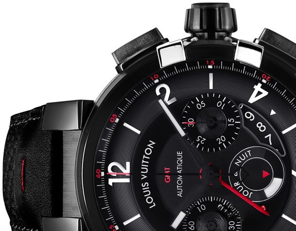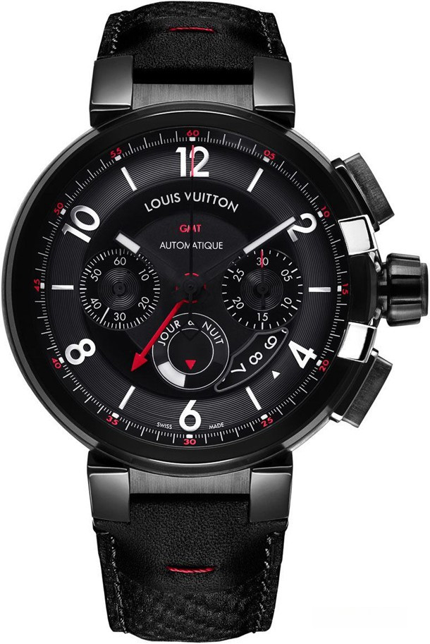 Louis Vuitton Tambour éVolution Chronograph GMT in Black, диаметром 45 мм. Модель содержит Калибр LV92 с автозаводом, практически такой же часовой механизм, как и у Louis Vuitton Tambour éVolution GMT in Black, но с модулем хронографа. Таким образом, получается тот же циферблат с индикацией двух часовых зон в несколько большем корпусе с добавлением 30 минутного хронографа.