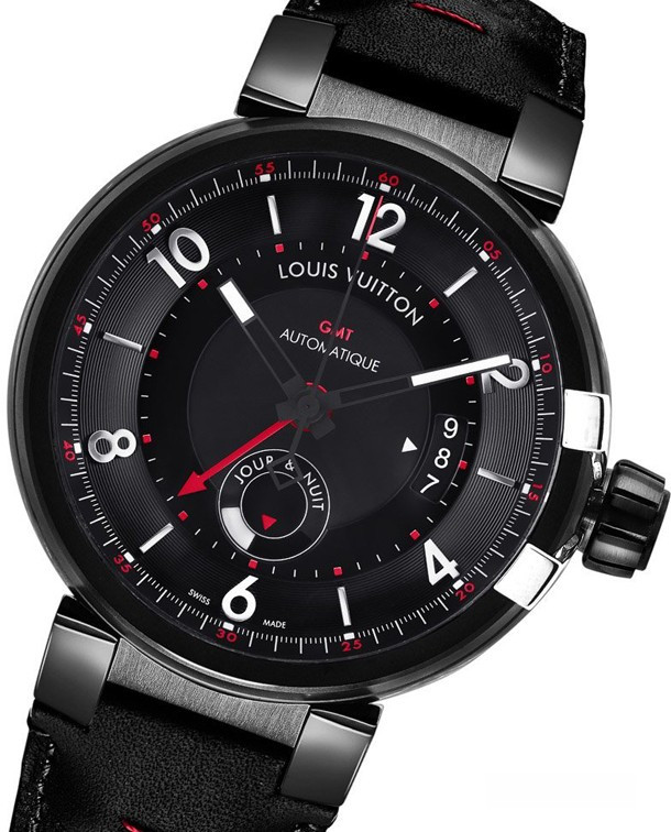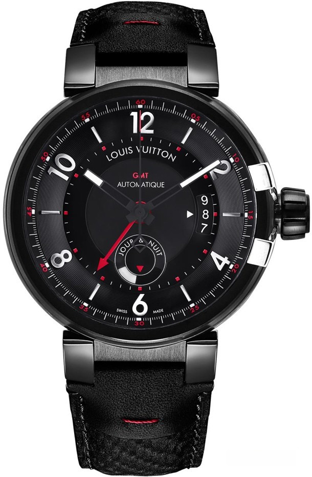 Louis Vuitton Tambour éVolution GMT in Black диаметром 43 мм и водонепроницаемость до 100 метров. С прекрасно собранным циферблатом, эти часы содержат автоматический Калибр LV71 (не мануфактурный), работающего с частотой 4 Гц при 42 часов запаса хода, который отображает время двух часовых поясов с индикатором дня / ночи для второй часовой зоны и индикатором даты. Это не совсем истинная индикация GMT, потому что индикатор не указывает на одну из временных зон в 24-часовом формате, но вместо этого использует вторую 12-часовую стрелку. Принцип один и тот же, но придуман для "часов с двумя временными зонами". Проще говоря, имеем две часовых стрелки, каждая из которых представляет разный часовой пояс. Как часы для путешествий, Louis Vuitton Tambour eVolution GMT in Black имеют по-современному строгий вид с приметными акцентами черного и красного цветов.