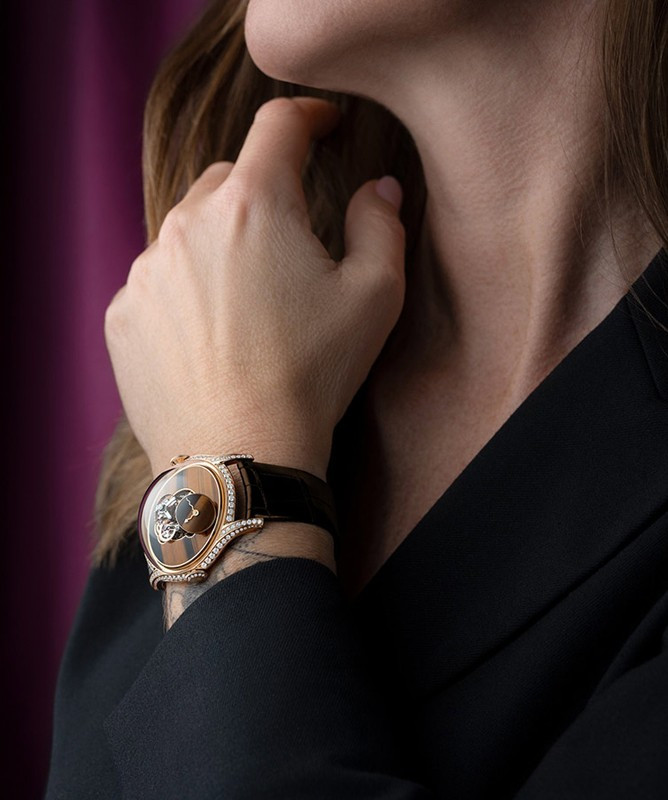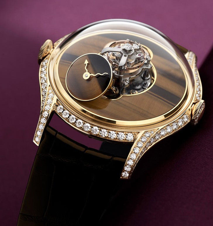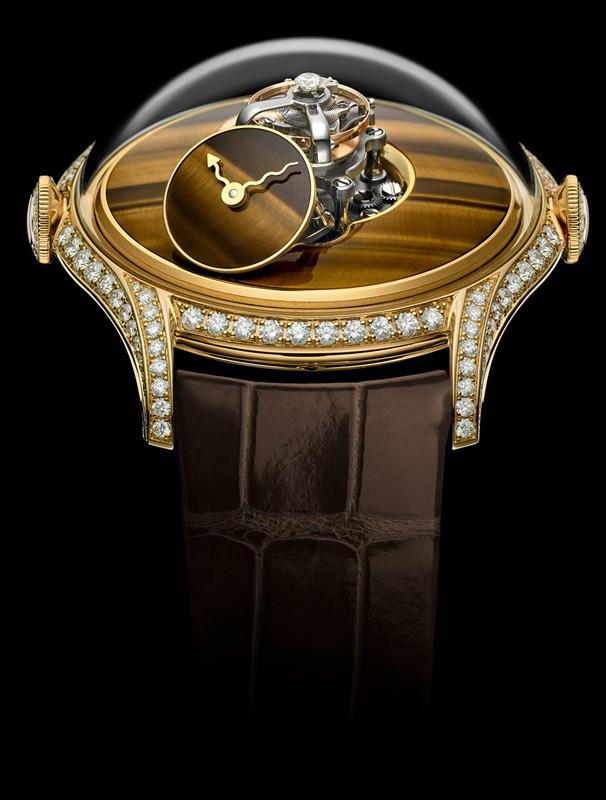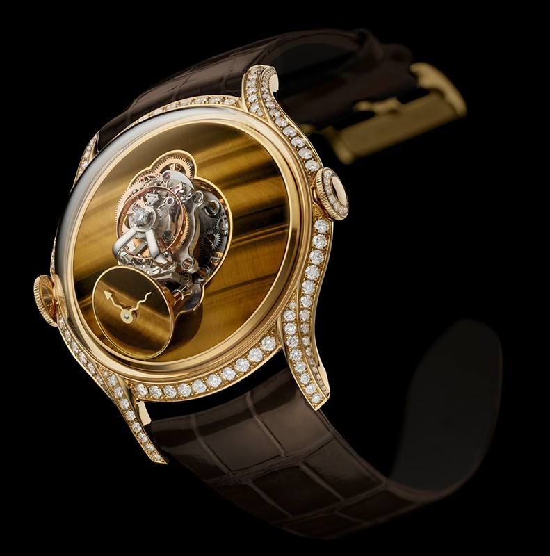 Часы MB&F Legacy Machines FlyingT представлены в корпусе из розового золота 18к размером 39 х 20 мм и водонепроницаемостью 30 метров. Внутри корпуса установлен автоматический механизм, обладающий запасом хода 100 часов. На коричневом циферблате отображаются часы, минуты. Модель комплектуется ремешком из кожи аллигатора с золотой застежкой. Корпус инкрустирован белыми бриллиантами.