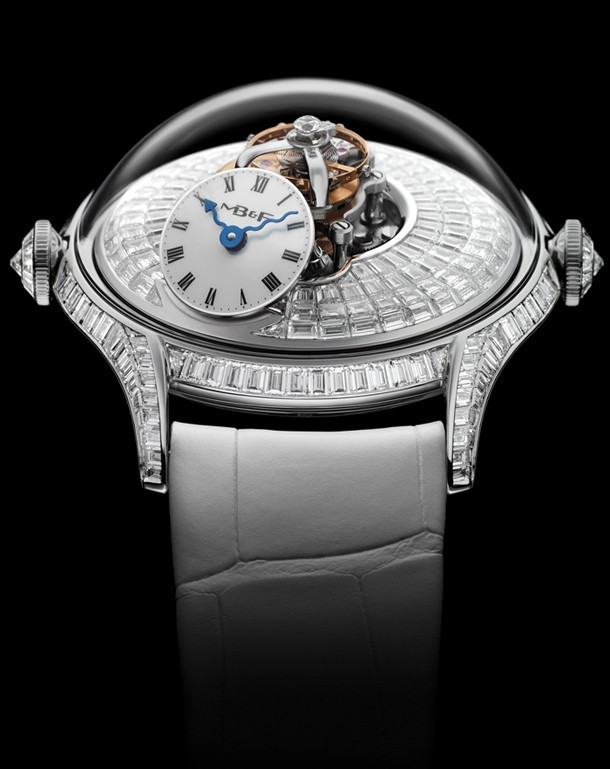 Часы MB&F Legacy Machines FlyingT представлены в корпусе из белого золота 18к размером 38.5 х 20 мм и водонепроницаемостью 30 метров. Внутри корпуса установлен автоматический механизм, обладающий запасом хода 100 часов. На циферблате из белых багетных бриллиантов отображаются часы, минуты. Модель комплектуется черным ремешкомс вставкой из белого золота 18к. Корпус инкрустирован белыми багетными бриллиантами.