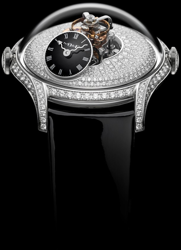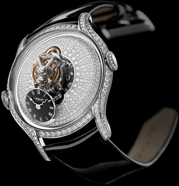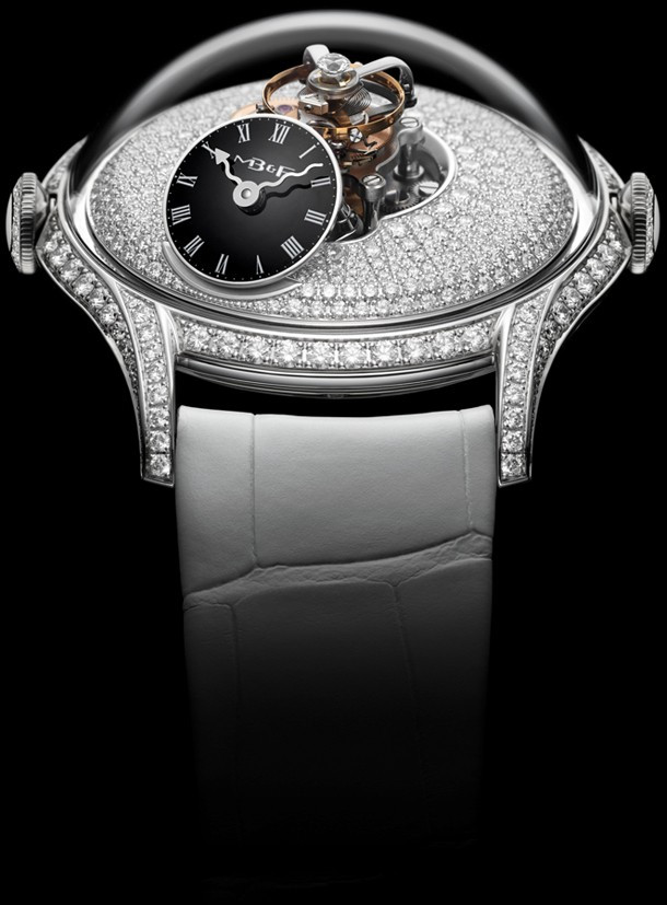 Часы MB&F Legacy Machines FlyingT представлены в корпусе из белого золота 18к размером 38.5 х 20 мм и водонепроницаемостью 30 метров. Внутри корпуса установлен автоматический механизм, обладающий запасом хода 100 часов. На циферблате из белых бриллиантов отображаются часы, минуты. Модель комплектуется черным ремешкомс вставкой из белого золота 18к. Корпус инкрустирован белыми бриллиантами.