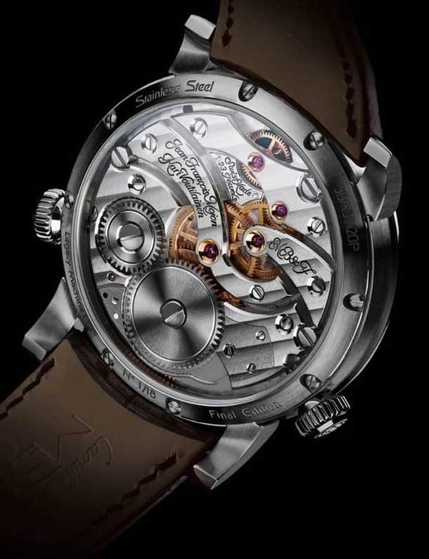 Будучи верными стилю высококачественных карманных часов 19-го века, LM1 имеют откалиброванный на частоту в 2,5 Гц балансирный механизм большого диаметра с традиционной спиралью Breguet, и открытый для вида загадочный регулировочный механизм, не имеющий явной связи с часовым. Регулировка часов и минут на каждом из двух субциферблатов происходит абсолютно независимо друг от друга. Миниатюрный секстант, первый в мире вертикальный индикатор запаса хода, отслеживает оставшуюся мощность, обеспечивая визуальный трехмерный контраст изящным дугам, поддерживающим балансирный механизм. Часы Legacy Machine N°1 FE представлены в лимитированной серии из 18 единиц в корпусе из нержавеющей стали с превосходным коричневым циферблатом. Независимый часовщик Кари Вутилайнен взял на себя ответственность за эстетический дизайн с уважением ко всем строгим традициям и отделке. Безупречный женевский волнистый узор, полированные золотые гнезда для камней и мосты с отменно снятой фаской на внутренних углах (что не может быть выполнено машиной) демонстрируют абсолютно бесподобный уровень отделки. Часовой механизм Legacy Machine N°1 гордо носит имена своих создателей.