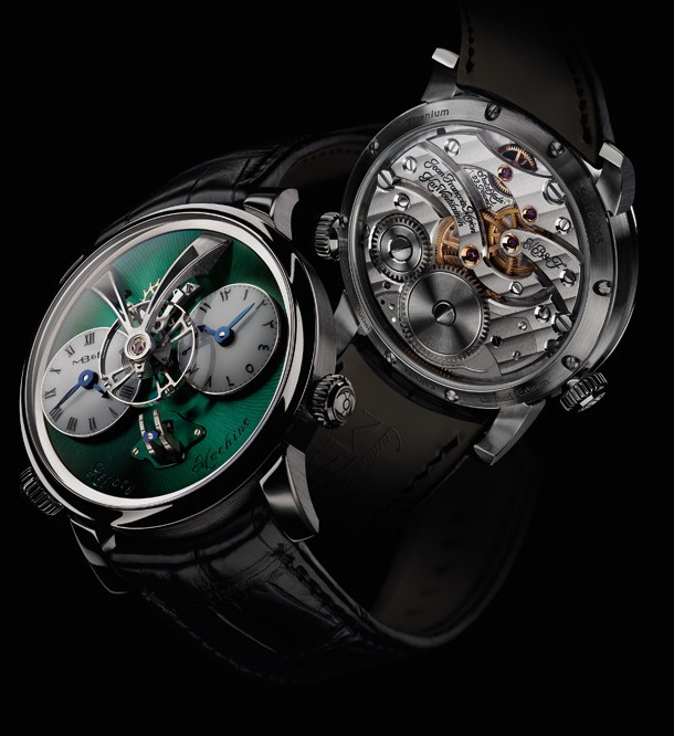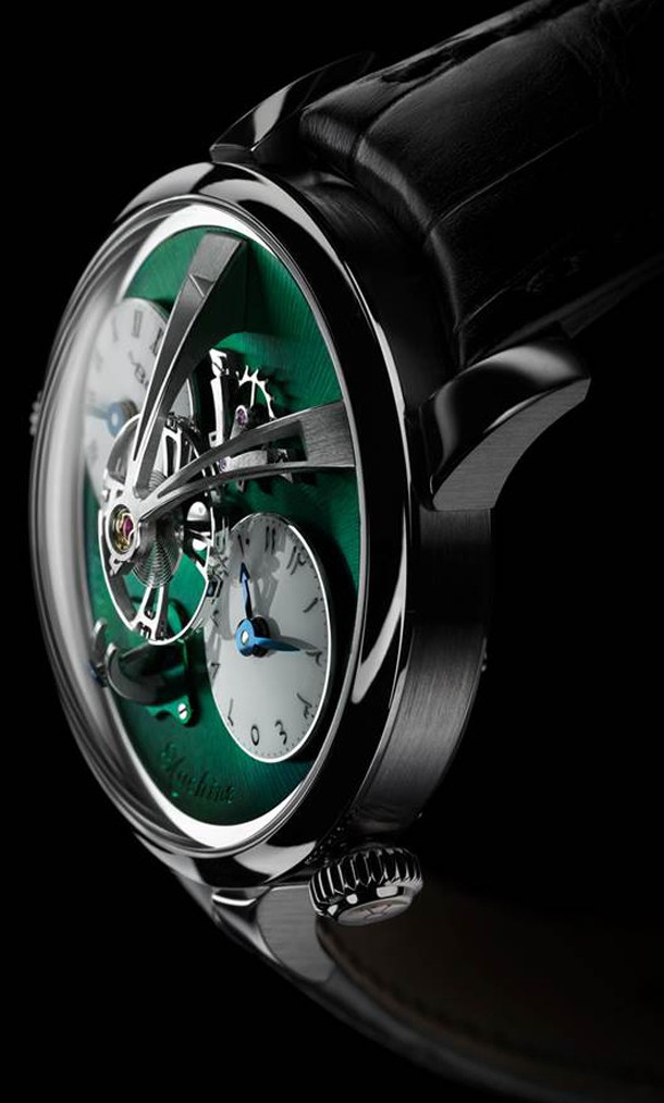MB&F создали специальную серию часов LM1 M.A.D. Dubai эксклюзивно для одного из главных партнеров Ahmed Seddiqi & Sons на Востоке. Не так давно в Дубае открылся салон MB&F M.A.D.Gallery. В честь фирменного бутика и была выпущена уникальная модель в количестве 13 штук. Модель LM1 M.A.D. Dubai привлекает внимание насыщенным зеленым цветом циферблата. а также арабской вязью на циферблате, обозначающим домашнее время. Для корпуса используется сплав Ti-6Al-4V, который состоит из чистого титана, 6% алюминия, 4% ванадия и небольшого количество железа и кислорода. Сплав Ti-6Al-4V намного прочнее титана и обладает особой легкостью и устойчивостью к коррозии. Превосходный мануфактурный механизм излучает невероятный талант его создателей, Жана Франсе-Можона и Кари Вутилайнена. Восхитительные женевские волны, полированные до зеркального блеска золотые шатоны, англажированные мосты, которые можно обработать только вручную – отображают особый подход мастеров к изготовлению механизмов. Имена создателей Калибра выгравированы на механизме.
