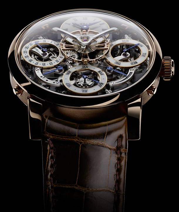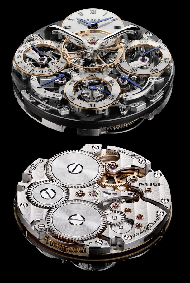 Начав с чистого листа, MB&F и независимый ирландский часовщик Стивен МакДоннел заново изобрели вечный календарь – самое известное часовое усложнение. Результатом этого стали завораживающие часы Legacy Machine Perpetual с механизмом собственного производства. Авторы уникальной модели полностью переосмыслили конструкцию, с тем чтобы избавиться от недостатков, свойственных традиционным вечным календарям. В положении «12 часов», между изысканно изогнутыми арками баланса, находятся часовая и минутная стрелки. Далее по часовой стрелке: индикатор дней недели на отметке «3 часа», индикатор запаса хода («4 часа»), месяца («6 часов»), ретроградный индикатор високосного цикла («7 часов») и указатель даты («9 часов»). Модель Legacy Machine Perpetual выпущена лимитированной серией из 25 экземпляров.